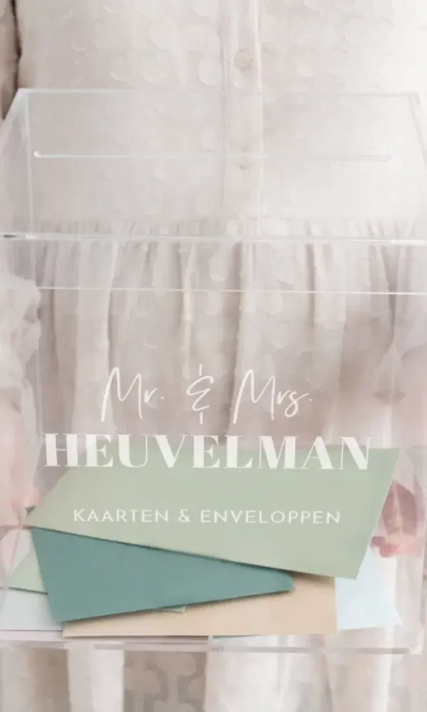 Win een gepersonaliseerde acryl enveloppendoos naar keuze van We Love Deco, ter waarde van €62,99! Wij geven er maar liefst 8 weg. Aangezien er vaak een envelop als cadeau wordt gegeven bij een bruiloft, is een enveloppendoos onmisbaar. Hoe leuk is het dat jullie deze ook nog helemaal naar jullie wens mogen maken?