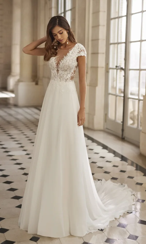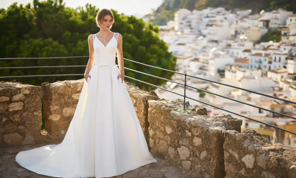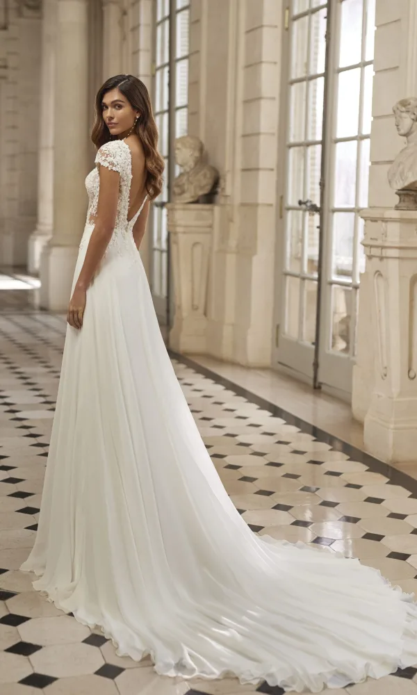- Kleinere bruiden: Een A-lijn heeft een verlengend effect. Door de vloeiende lijn van de taille naar de grond lijk je optisch groter, zeker in combinatie met een V-hals.