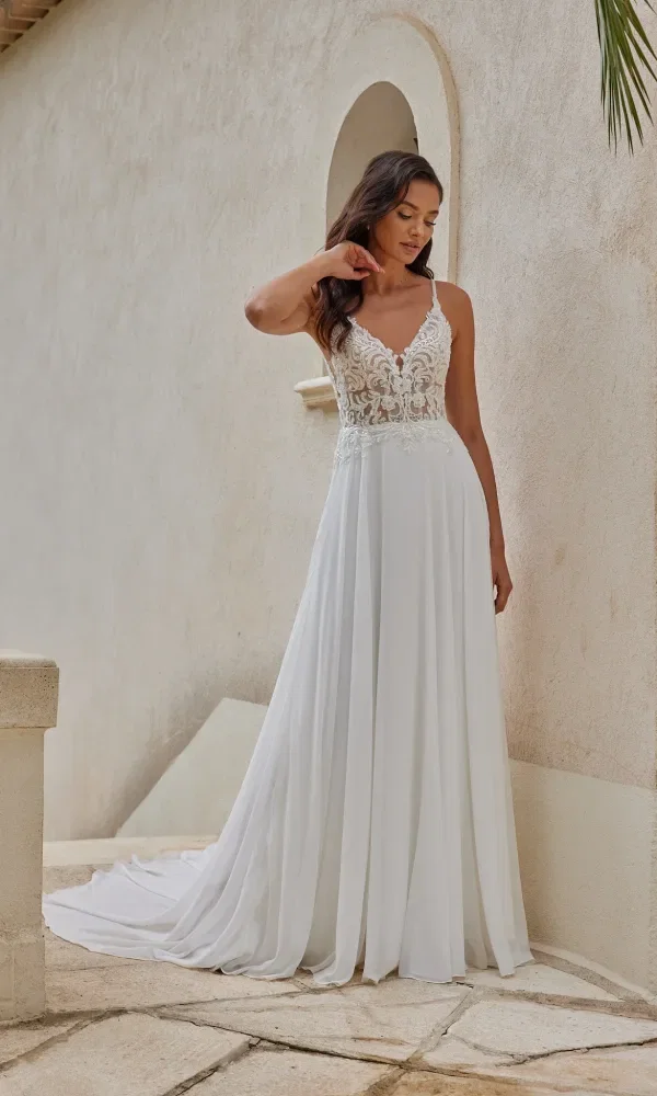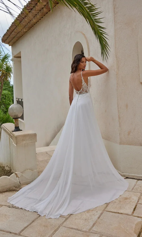 Is een A-lijn geschikt voor een huwelijk aan de kust? Absoluut! Kies dan voor een lichte stof zoals chiffon. Het waait mooi mee in de zeebries en is niet te zwaar om in het zand te wandelen.