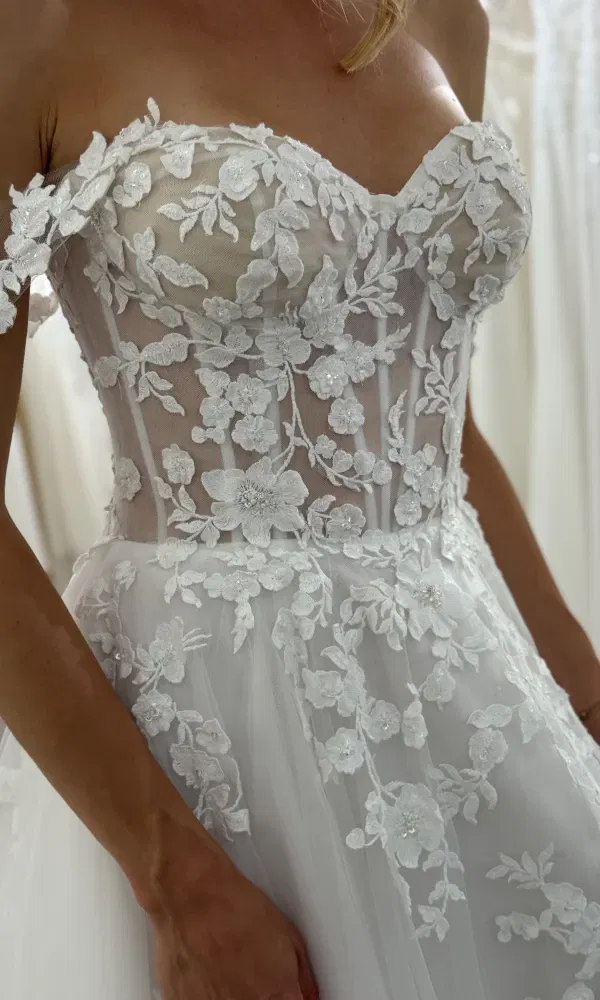 Een moderne kanten trouwjurk met korset is dé keuze voor bruiden die houden van romantiek, maar dan met een frisse twist. Het semi-transparante korsetlijfje laat net genoeg huid zien om verleidelijk te zijn, zonder zijn elegantie te verliezen. De zichtbare baleinen geven structuur aan trouwjurk Bennet en creëren dat geliefde zandloper silhouet, terwijl vetersluiting aan de achterkant zorgt voor een perfecte pasvorm.