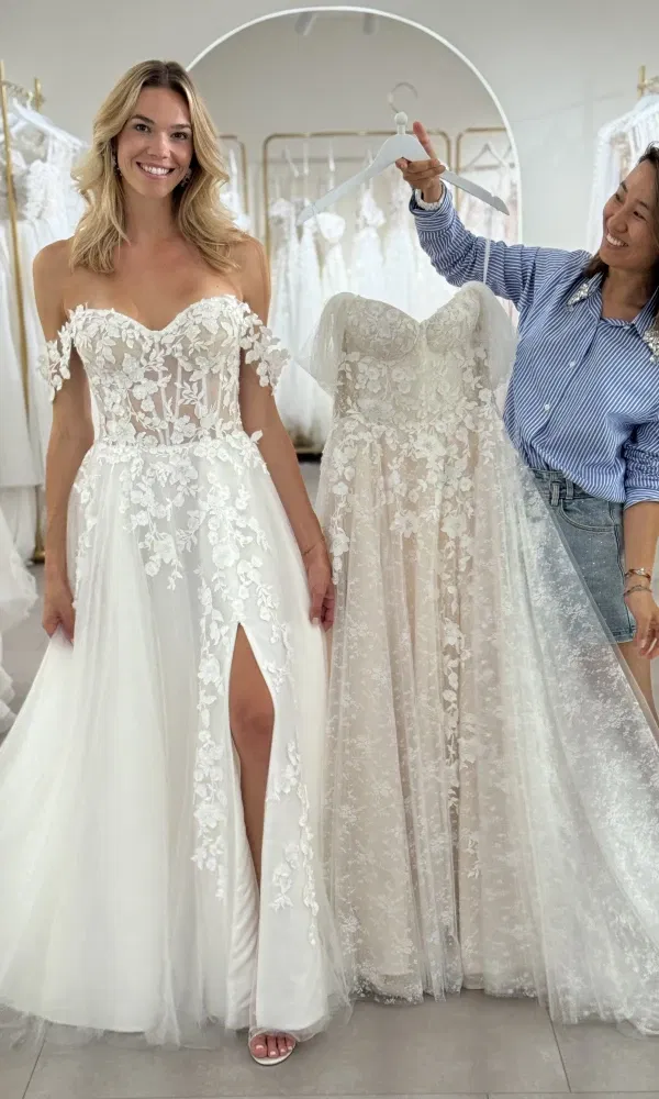 Heb je exact in gedachten hoe jouw droomjurk eruit moet zien? Dan biedt Casablanca bijna eindeloze mogelijkheden om je jurk volledig op maat te maken. In een bezoek aan de Bruidswinkel White Silhouette (gespecialiseerd in Casablanca-jurken) laat bridal-stylist Fan Xia zien hoe maatwerk in München eruitziet. Ze werkt al tien jaar met Casablanca-jurken en heeft in die tijd veel bruiden blij gemaakt met persoonlijke aanpassingen. “Als een bruid haar eigen droomjurk wil ontwerpen, bijvoorbeeld door mouwen toe te voegen of weg te laten, de halslijn aan te passen of zelfs de stof te vervangen, dan is dat mogelijk!”