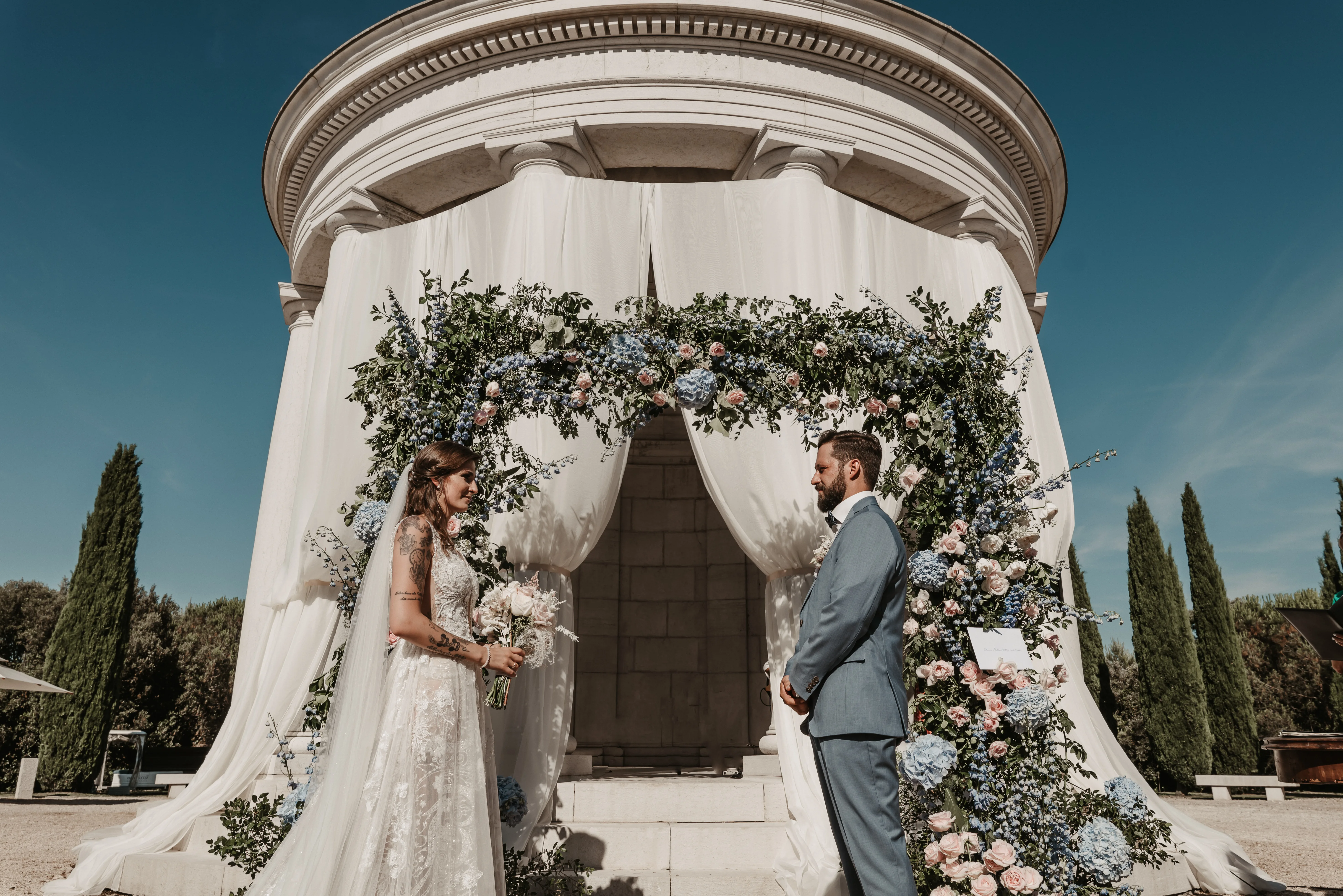 Veel pasgetrouwden kiezen voor een openluchtceremonie. Frisse lucht en zonnestralen op de huid maken de gelukshormonen niet allen los bij het bruidspaar, maar ook bij de gasten. Een klein paviljoen of een met bloemen versierde boog op de achtergrond zijn ook geschikt voor als backdrop voor de fotomomenten.