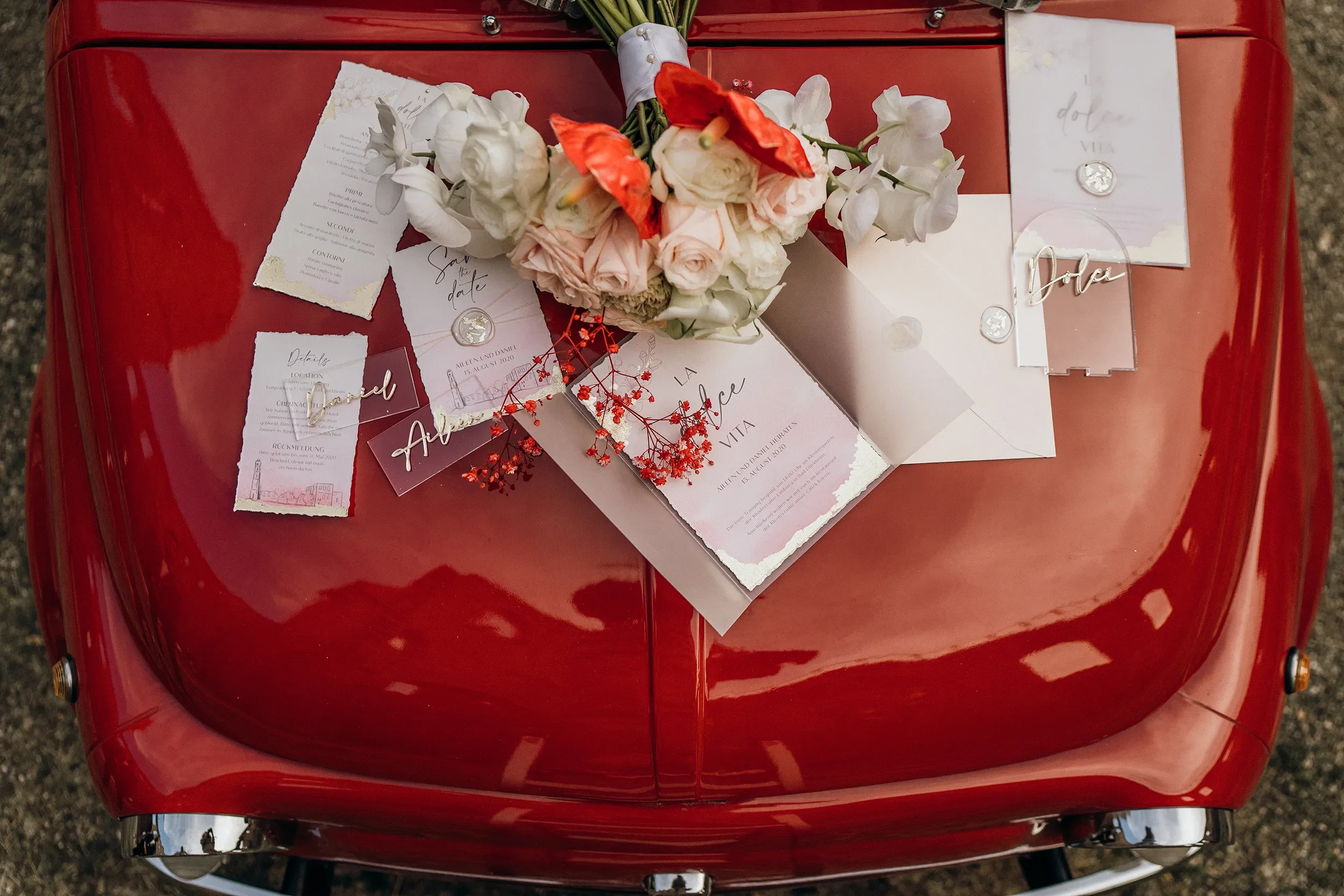 Wist je dat niet alleen de save-the-dress, uitnodigings- en plaatsingkaarten bedoeld worden met trouwpapeterie, maar alles wat is voorzien van tekst en beeld in stijl van de bruiloft? Zoals bijvoorbeeld een bedrukte loper in het gangpad naar het altaar. Ook hoeven het niet alleen producten van papier te zijn. Een mix van verschillende materialen, zoals acrylborden, edelsteenplaten of (plexi) glas maakt een bijzondere indruk.
