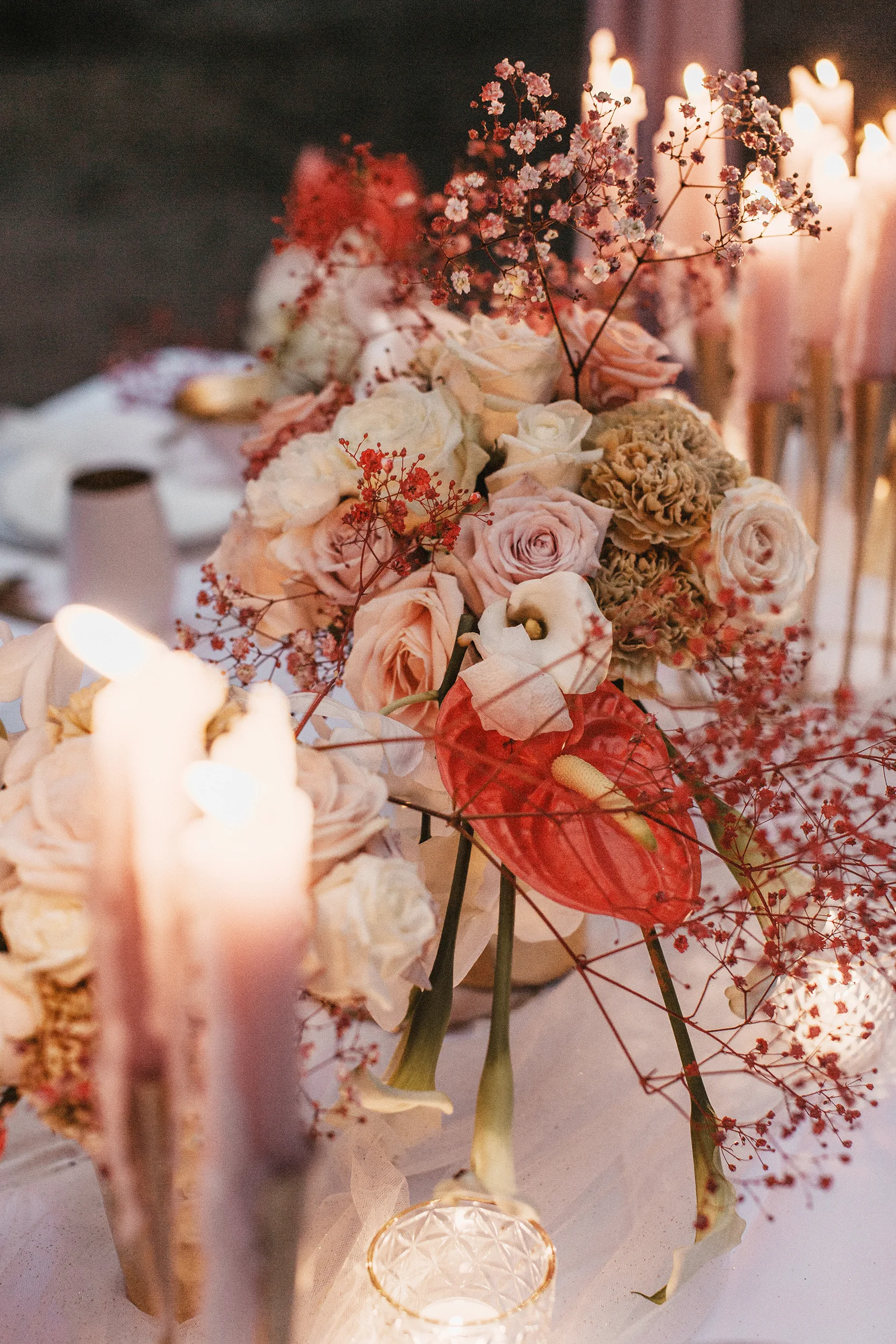 Dit boeket straalt romantiek uit door de rozen. Het roodgekleurde gipskruid zorgt voor een wilde, natuurlijke uitstraling, terwijl de glanzende flamingobloemen een exotisch tintje geven.