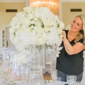 “Kies je voor stoelvaasjes langs het gangpad, geef die dan een mooie upgrade zodat ze er extra spetterend uitzien en hergebruikt kunnen worden op jullie tafels. Veel bruidsparen kiezen voor eyecatchers op zuil die achter hen staan tijdens de ceremonie. Die verhuizen vervolgens de hele dag mee naar de volgende ruimtes.”