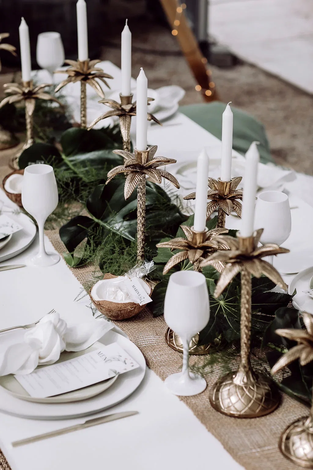 More is more – tenminste, als het gaat om een trouwdecoratie met tropische planten. Zo zorgen de hartvormige monsterabladeren als tafeldecoratie voor Bali vibes.