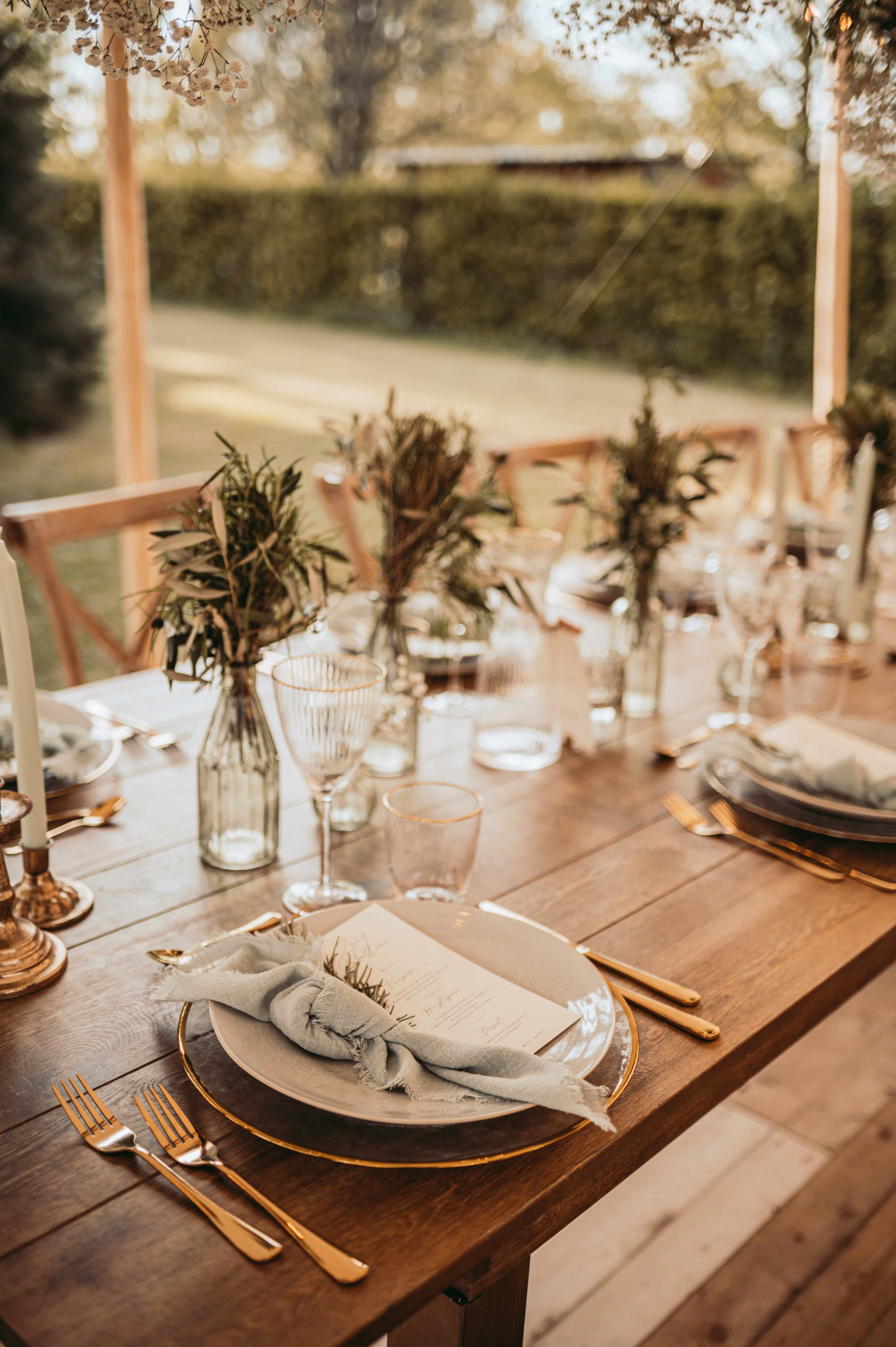 Beeld je in: de dinertafels, elegant gedekt, en in het midden een winterse centerpiece. De amaryllis, bijvoorbeeld, trekt meteen de aandacht. Omringd door een verzameling van rozen en ranonkels. Maar de echte sfeermakers? De dennen en eucalyptus! Het groen van de dennen gecombineerd met de grijsgroene tinten van de eucalyptus vormen een winterse combinatie. Het geheel voegt diepte en textuur toe aan de tafeldecoratie.