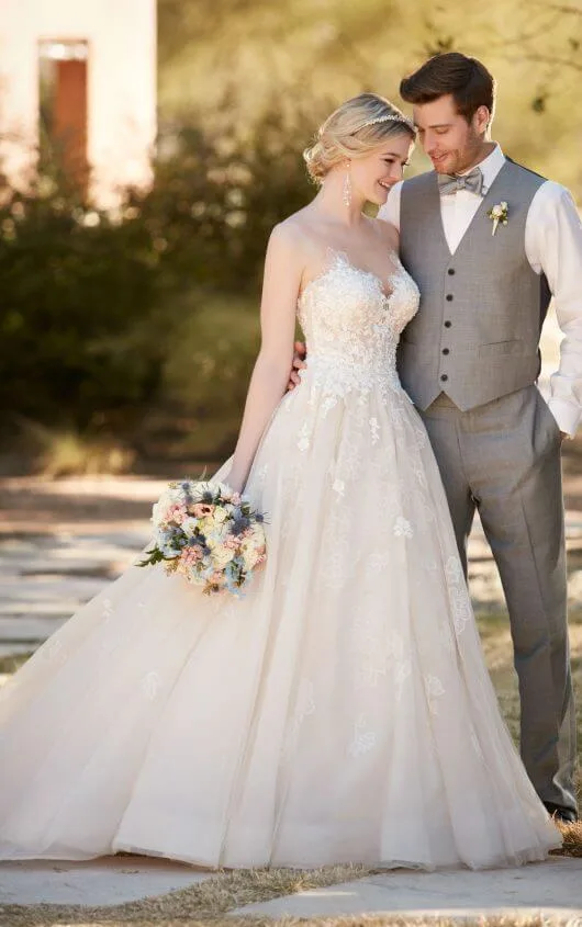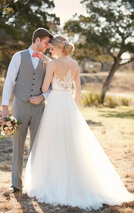 Ragfijne laagjes tule gecombineerd met kanten applicaties maken van iedere jurk iets bijzonders. Maar als deze gedragen wordt tijdens een romantisch buitenfeest onder de sterren, wordt je look helemaal boho-chic. Het illusion kant is prachtig afgewerkt met gedetailleerde kralendecoraties die deze Essense of Australia-jurk een vleugje glans geven. Een bruidegom in een grijs trouwkostuum met vlinderstrik past perfect bij jouw gracieuze A-lijnjurk. Maak je look compleet met een kleurrijk boeket van seizoensbloemen.