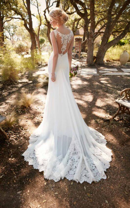 Helemaal hot voor boho-bruiloften zijn de illusion bruidsjurken met kanten rugdecolleté. Prachtig kant in gedetailleerde medaillonpatronen zijn bezaaid over de achterkant van deze prachtige A-lijnjurk van Frans tule. De kanten details geven deze Essense of Australia-jurk een hoge mate van elegantie en verfijndheid. Perfect voor een strandbruiloft of een jawoord diep in de bossen. Deze jurk biedt alles wat een boho-bruid zich kan wensen.