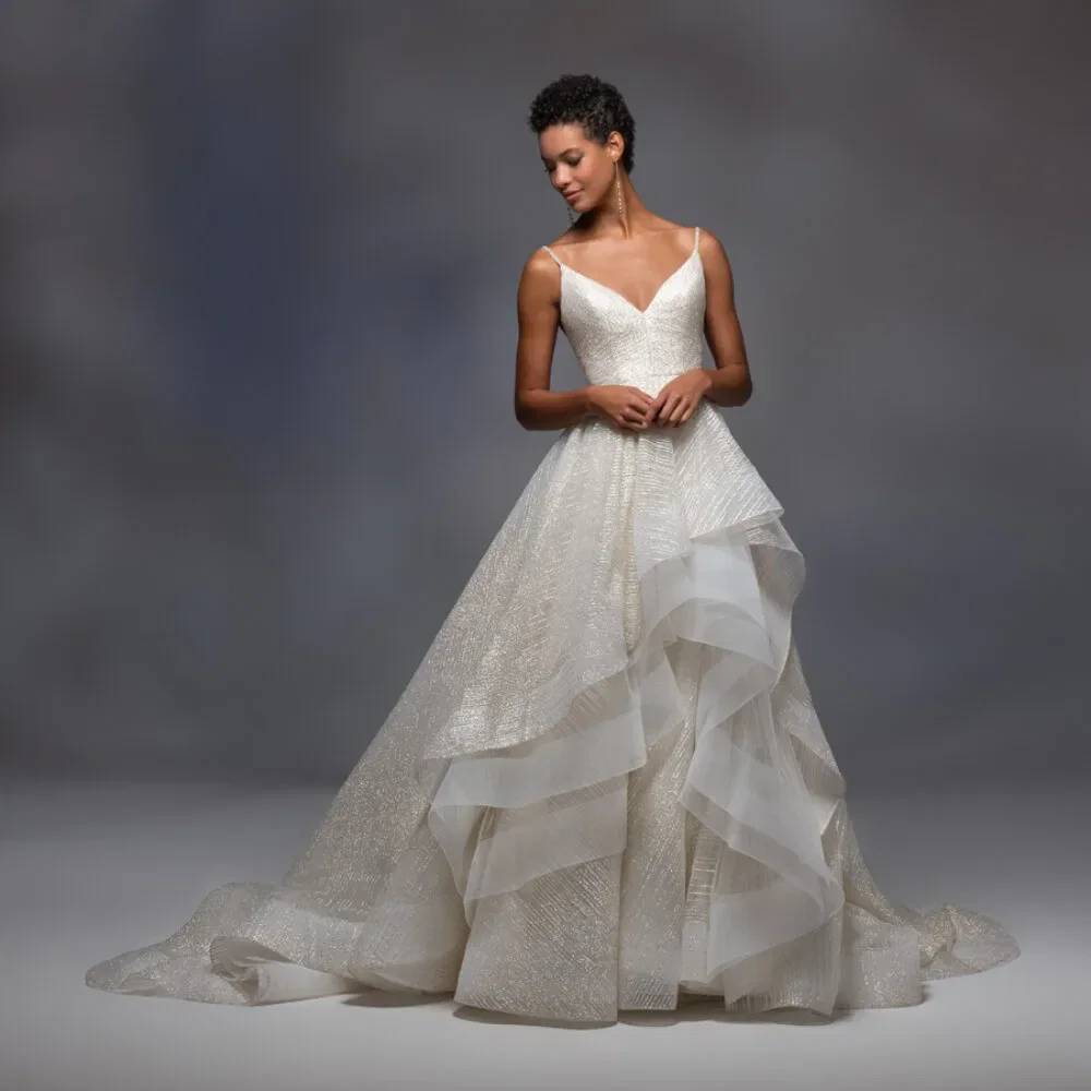 3. Bruidsjurk met asymmetrische waterval-rok van Lazaro.
