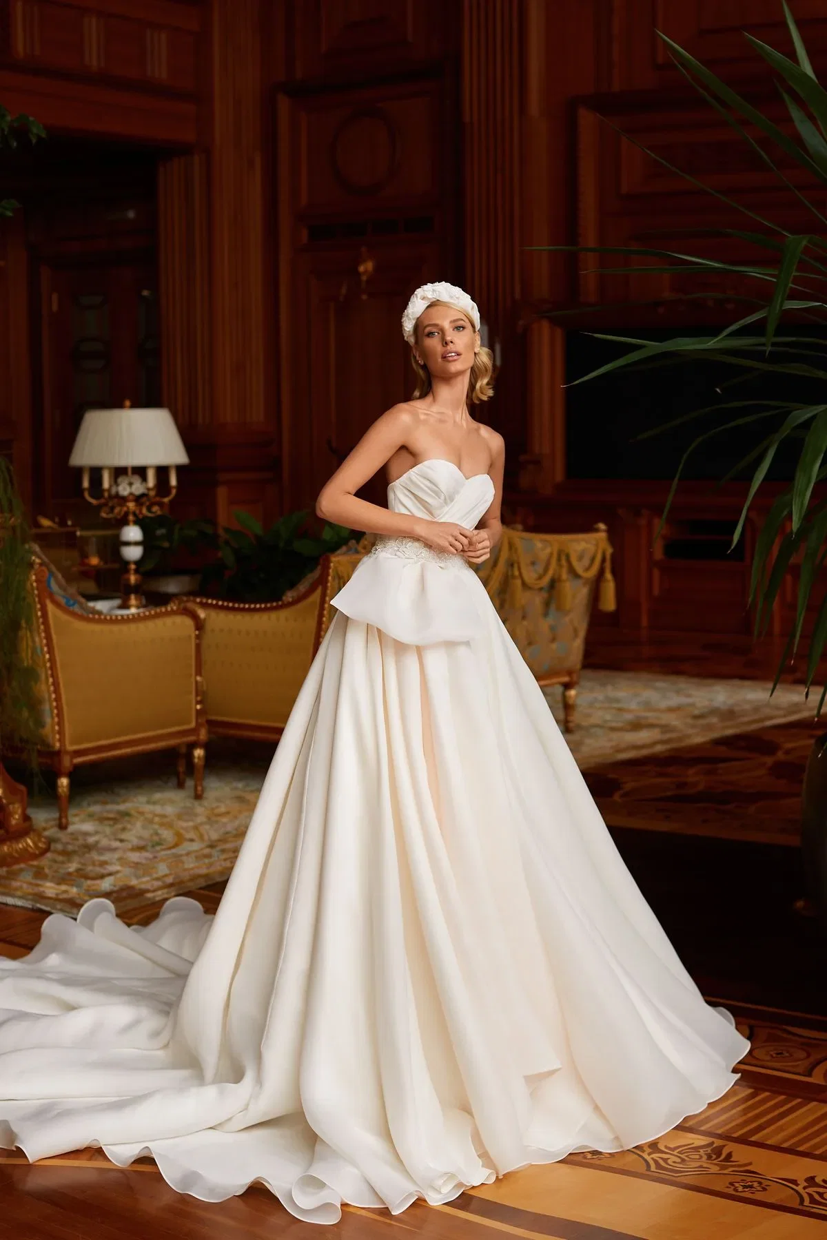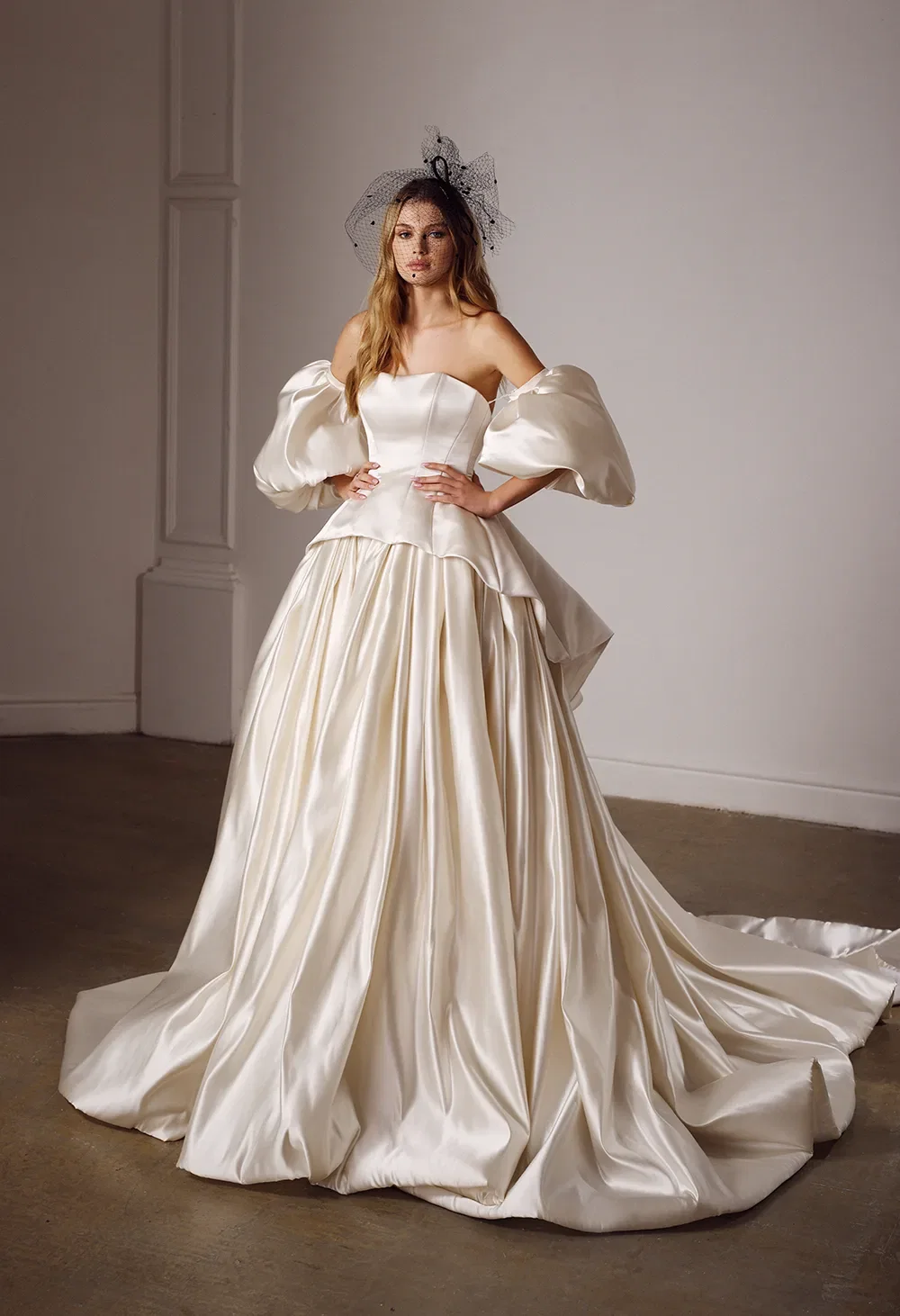1. Volumineuze satijnen trouwjurk met afneembare XXL pofmouwen van Galia Lahav.