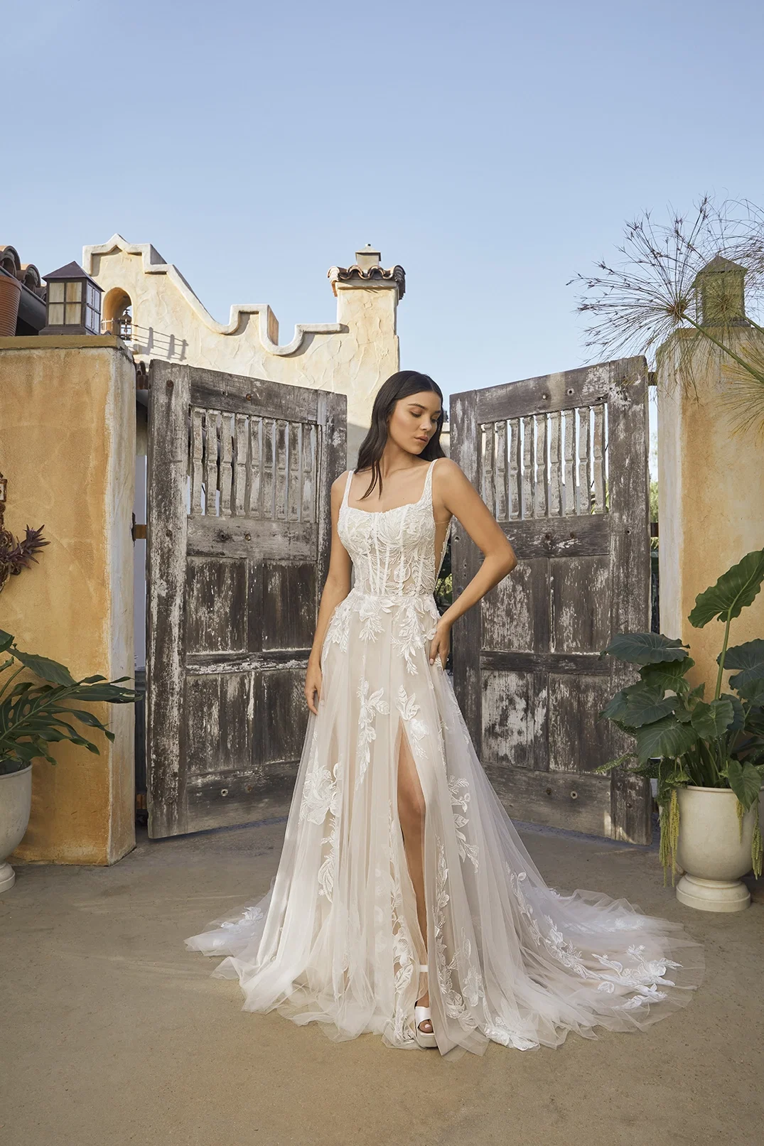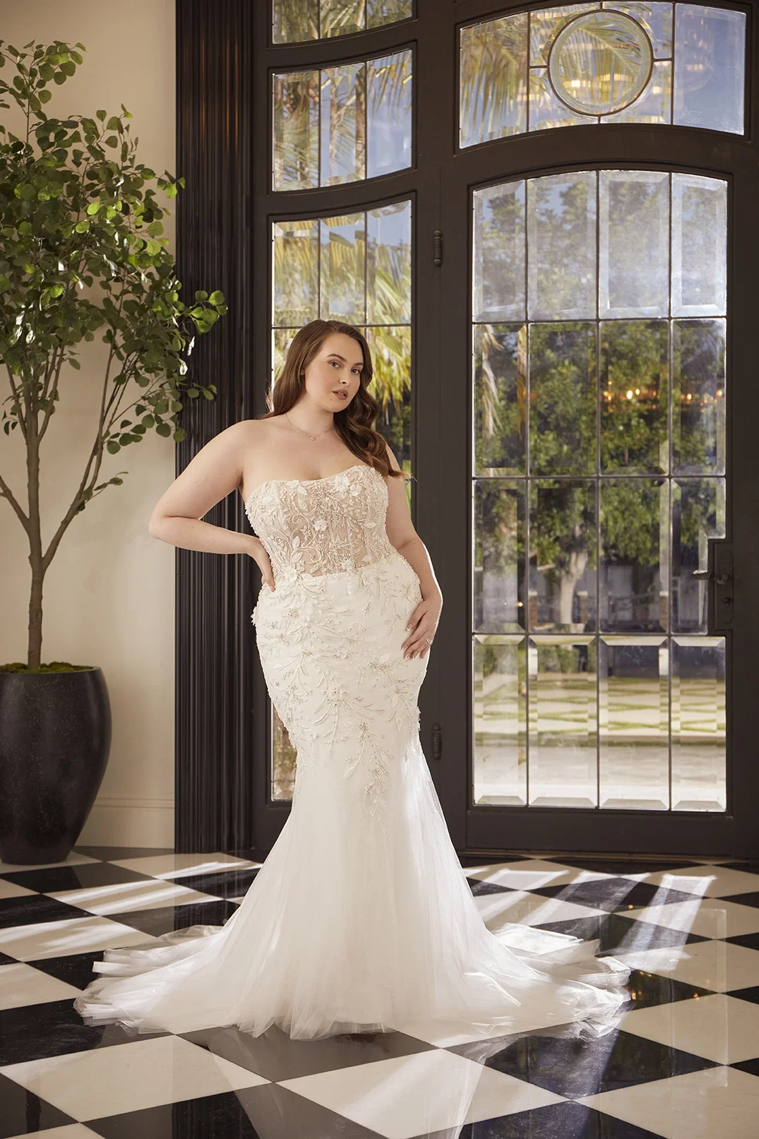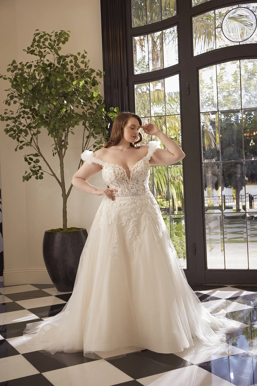 Dat Casablanca Bridal tot de meest succesvolle bruidsmode-ontwerpers behoort, komt ook door de maat-inclusieve ontwerpen zoals trouwjurk Corinne (linksonder). In plaats van te verhullen, accentueert deze kanten A-lijn jurk de borst en taille. Een bijzonder detail: de afneembare bandjes.