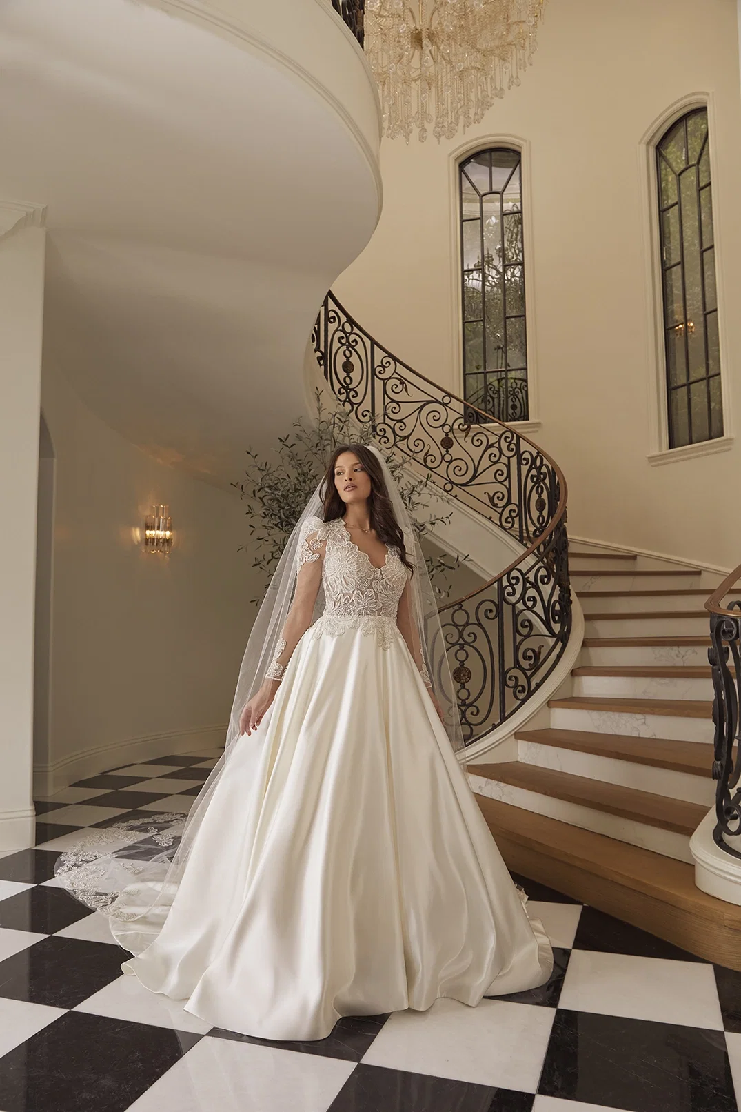 Traditie gecombineerd met moderniteit: met zijn delicate, schouder accentuerende mouwen, een sensuele V-hals en een volumineuze rok betovert Nadine (linksonder) bruiden die houden van een grootse entree.