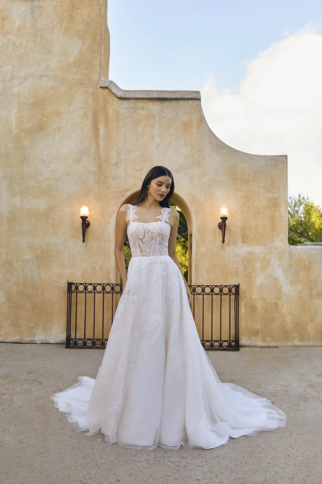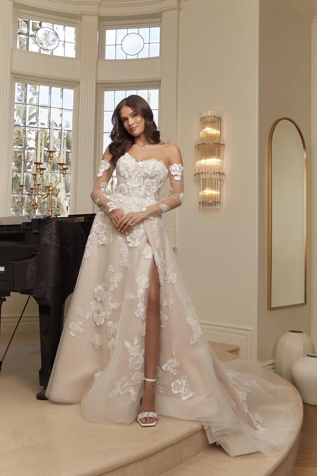 Gedurfder en moderner dan veel andere florale bruidsjurken speelt Maude (rechtsboven) met het verbluffende effect van 3D-applicaties. De bloemen, die bijna echt lijken, sieren niet alleen het korset en de rok, maar ook de afneembare bandjes en een bijpassende, optioneel verkrijgbare sluier.