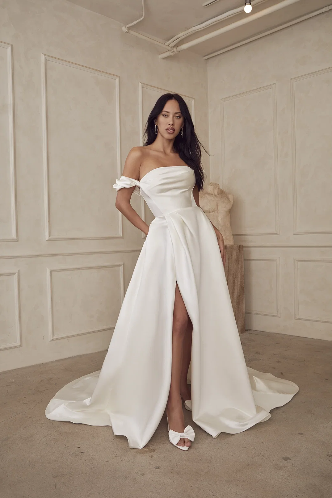Bruidsjurk Hepburn (linksboven) is het toonbeeld van tijdloze elegantie en doet denken aan de Hollywood-glamour van grote filmsterren. De parelversiering aan de omgeslagen halslijn maakt de verder eenvoudige prinsessenjurk uniek.