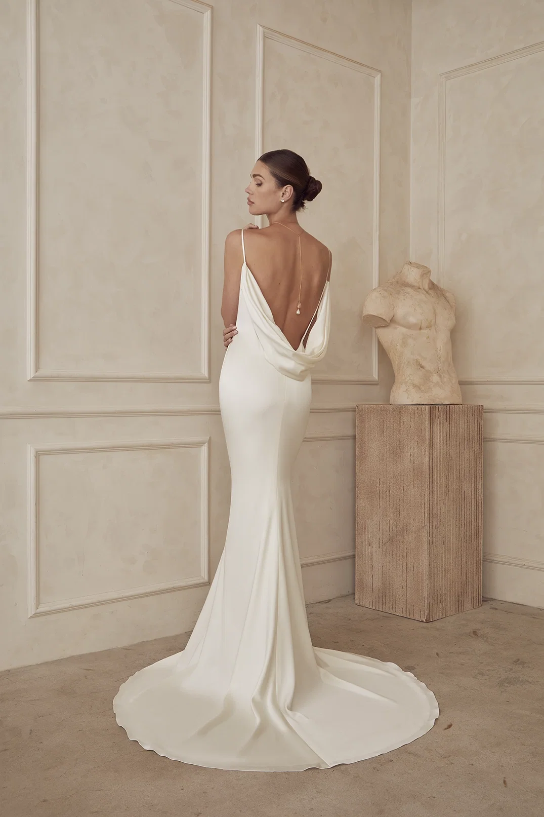 Bruidsjurk Ave (rechtsonder) verrast met een sensuele watervalhalslijn aan de achterkant. Perfect voor chignon-kapsels en delicate rugkettingen.
