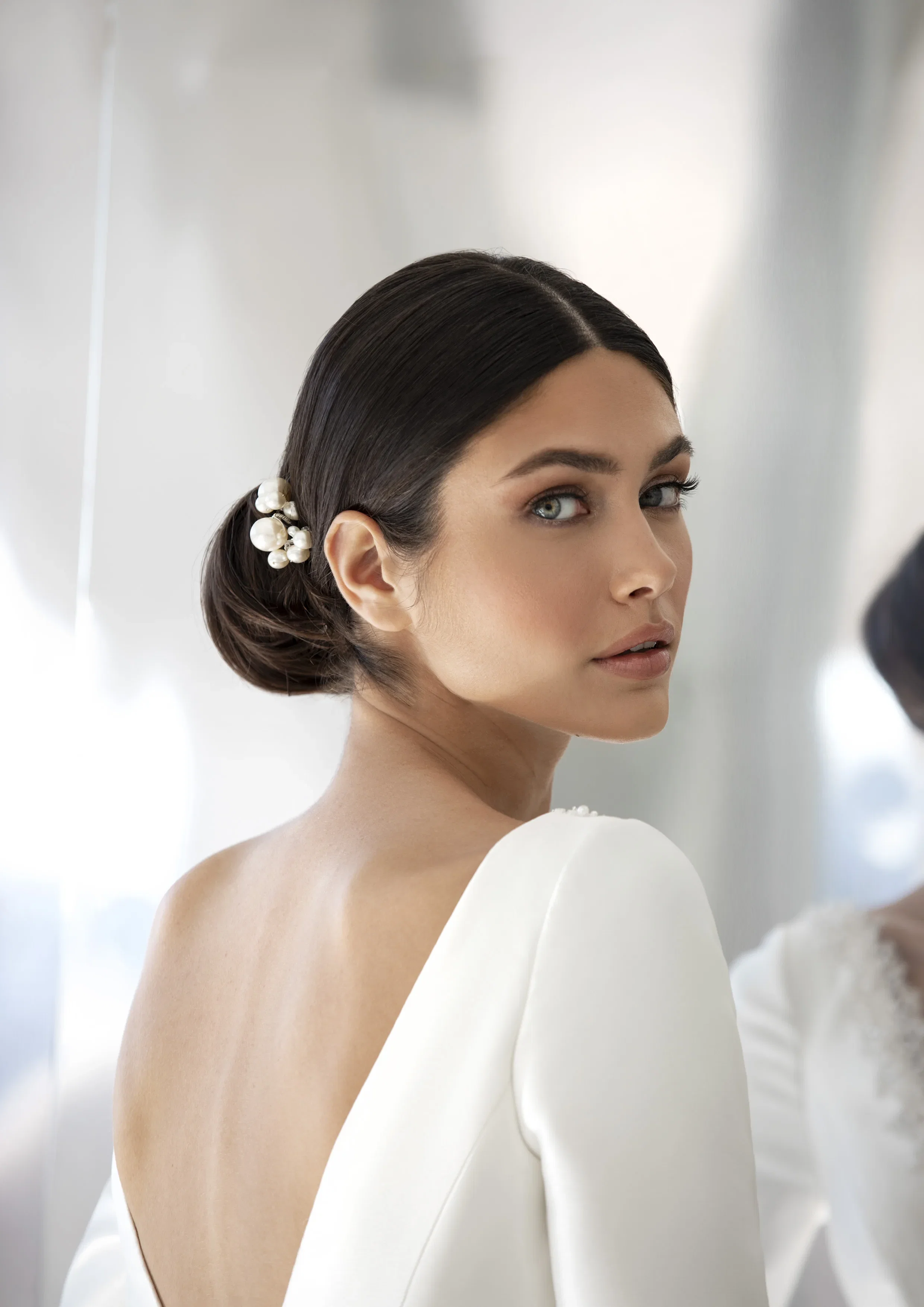 Los, als knot of als vlecht gedragen – creëer een elegante, cleane look door je haar met gel of haarlak naar achter te kammen. Dit kapsel past perfect bij glamoureuze trouwjurken.