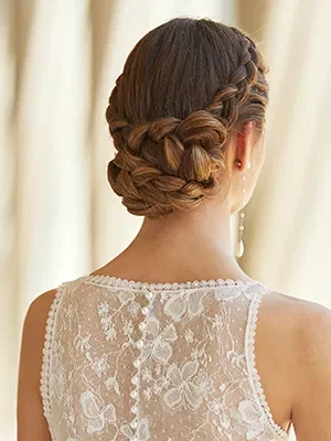 Gevlochten kapsels zijn romantisch en divers. Onze favorieten zijn de Franse, Nederlandse én de boerenvlecht – zoals deze Gretchen-variant. Hiervoor wordt het haar vanaf de middenscheiding in een kransvorm gevlochten. De uiteinden worden in elkaar geknoopt en met speldjes vastgestoken.