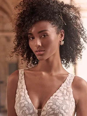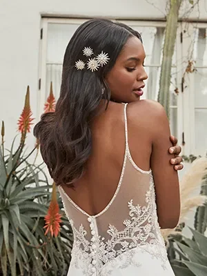 Steek krullen met geometrische haarspelden naar achter voor een sensueel bruidskapsel.