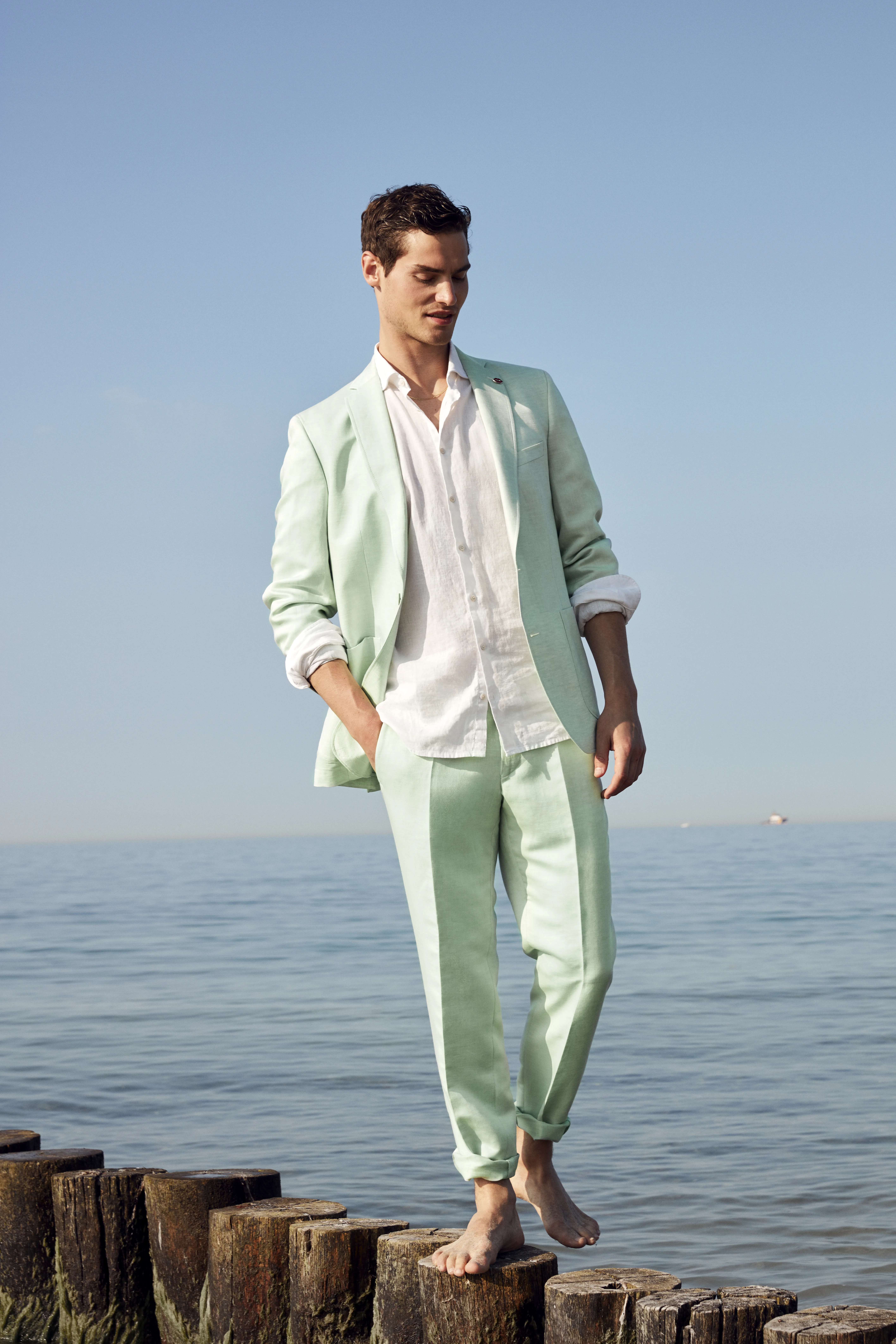Het kleurenschema van voor op het strand geschikte trouwpakken is geïnspireerd door de zee, het zand, de duinen en de lucht. Witte, licht en donkerbeige tinten en verschillende facetten van blauw of groen zijn razend populair.