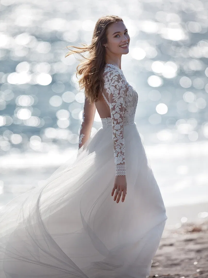 Bij trouwjurken voor strandbruiloften draait alles om lichte, luchtige stoffen voor een zorgeloze bruiloftslook. Vooral zacht tule is populair – deze zeer delicate stof oogt heel romantisch.