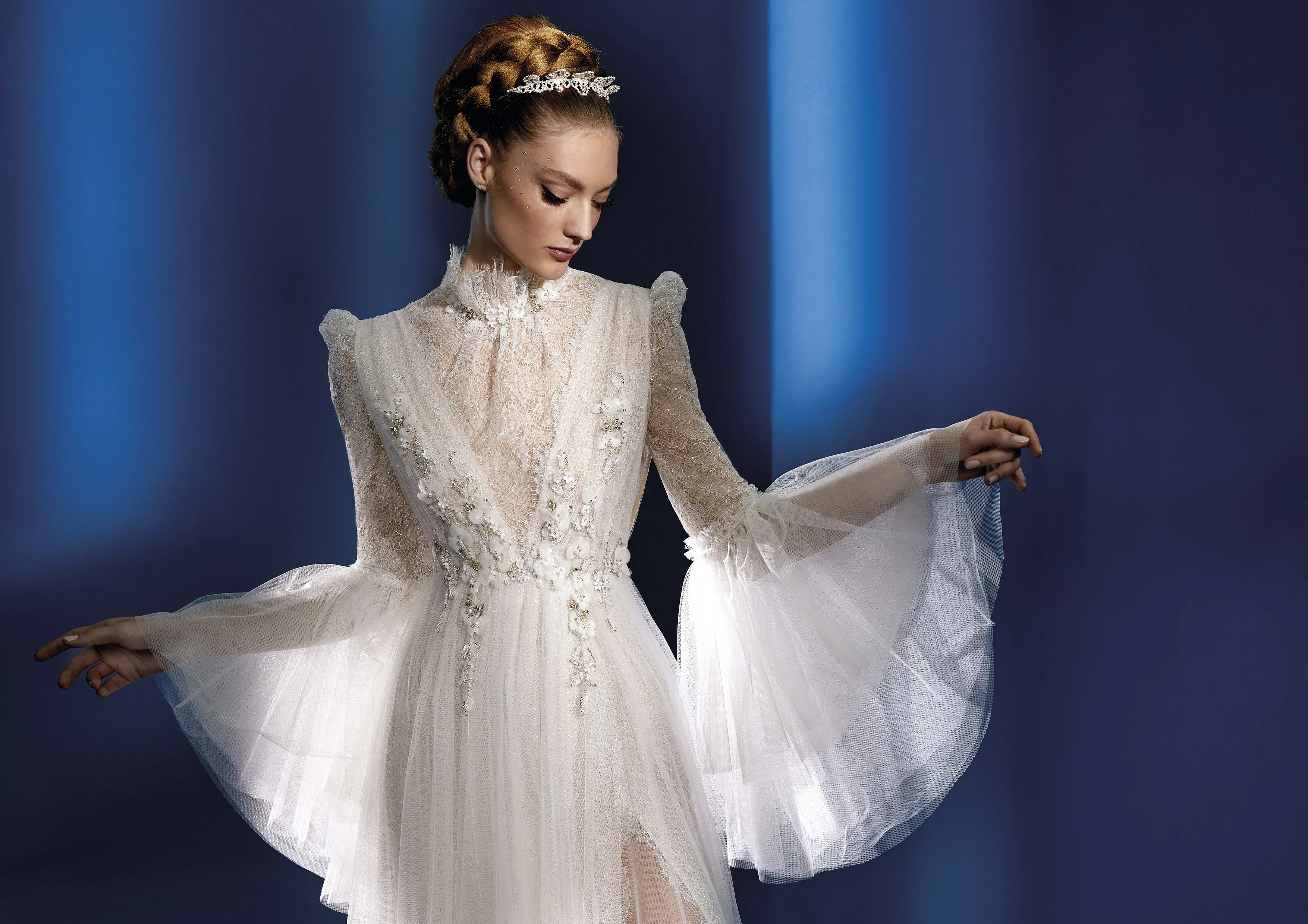 De Comtesse is een romantisch A-lijnjurk met opstaande draden en Chantilly-kant. De bruidsjurk heeft een sensuele hoge hals, gecombineerd met een diepe V-hals. Beide vol luxueuze bloemenborduursels en details van kristallen en strass-steentjes. De power schouders lopen uit tot lange kanten mouwen met ruches aan de manchetten. De indrukwekkende statement onderdelen van deze jurk zijn afneembaar, waardoor de bruidsjurk omgetoverd kan worden tot een heuse party dress.