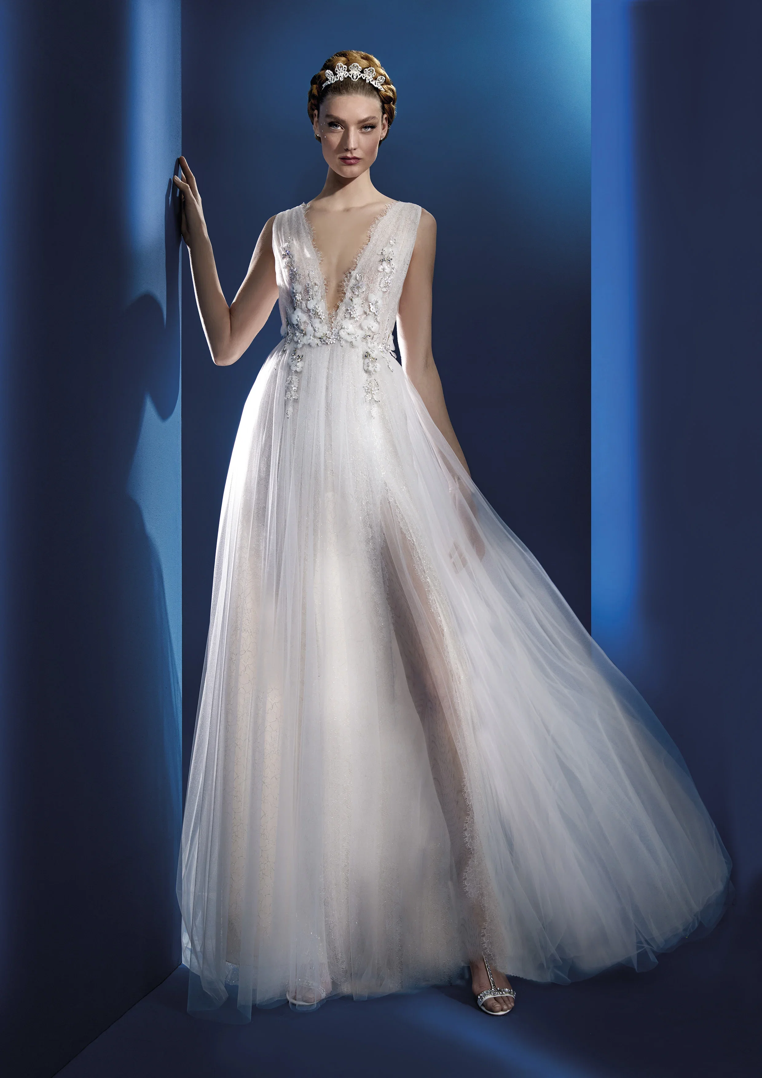 De Cheret (bovenste) staat voor pure glamour. Deze jurk heeft een diepe geschulpte guipurehalslijn, prachtig afgewerkt met een juweelachtig kralenwerk en bloemen voor een luxe uitstraling.