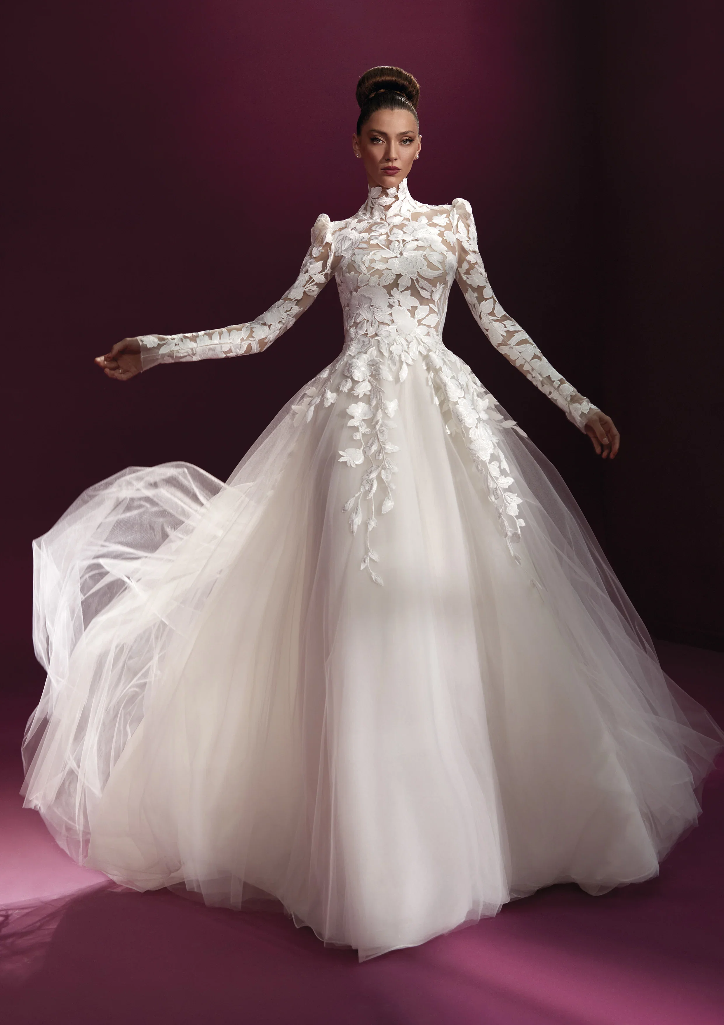 De Fayette is een majestueuze bruidsjurk met een kanten lijfje, prachtige zwanenhals en lange guipure kanten mouwen met power schouders. De jurk loopt in een waterval aan bloemen uit in een rok vol volume en luchtige lagen die voor beweging zorgt.