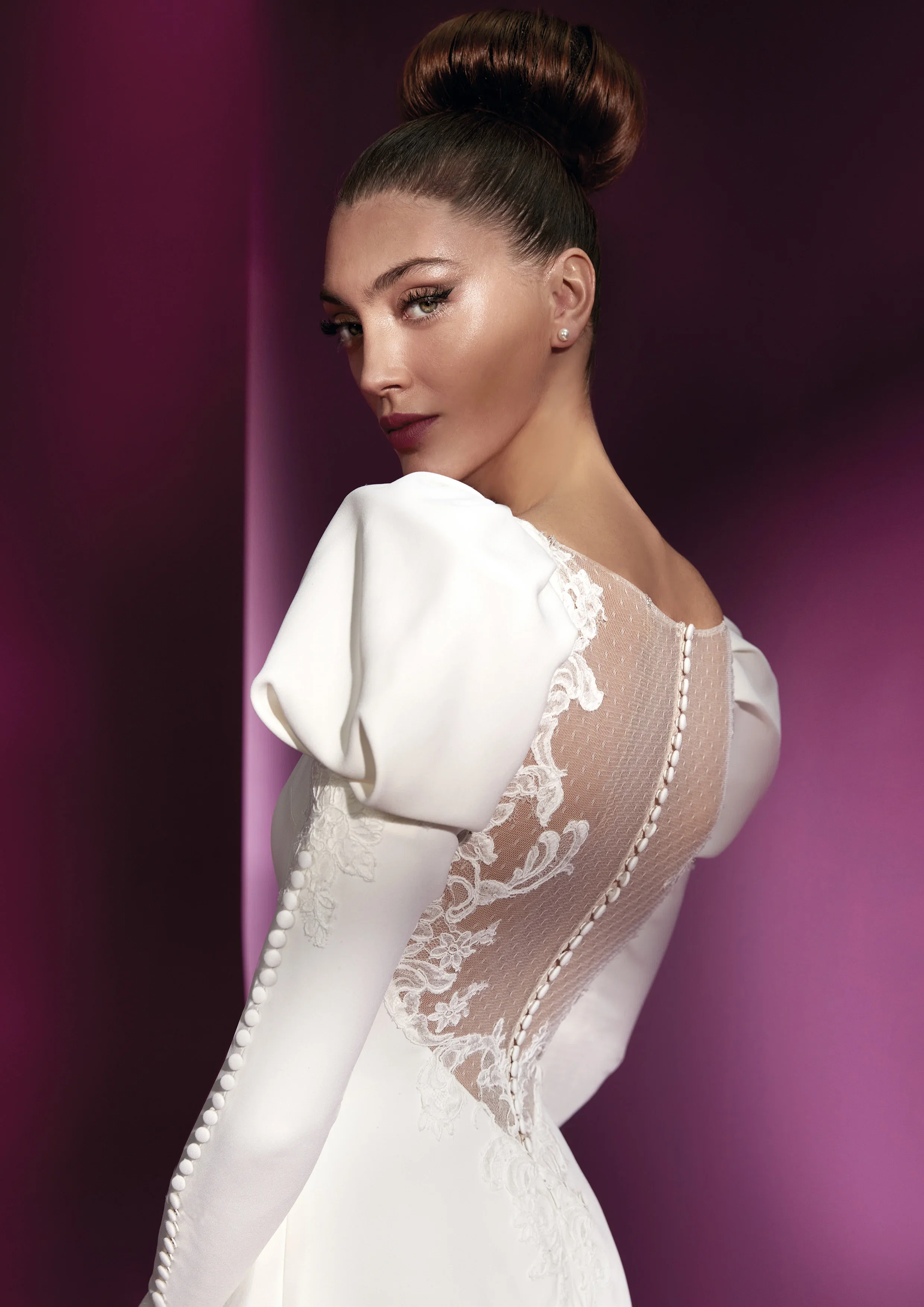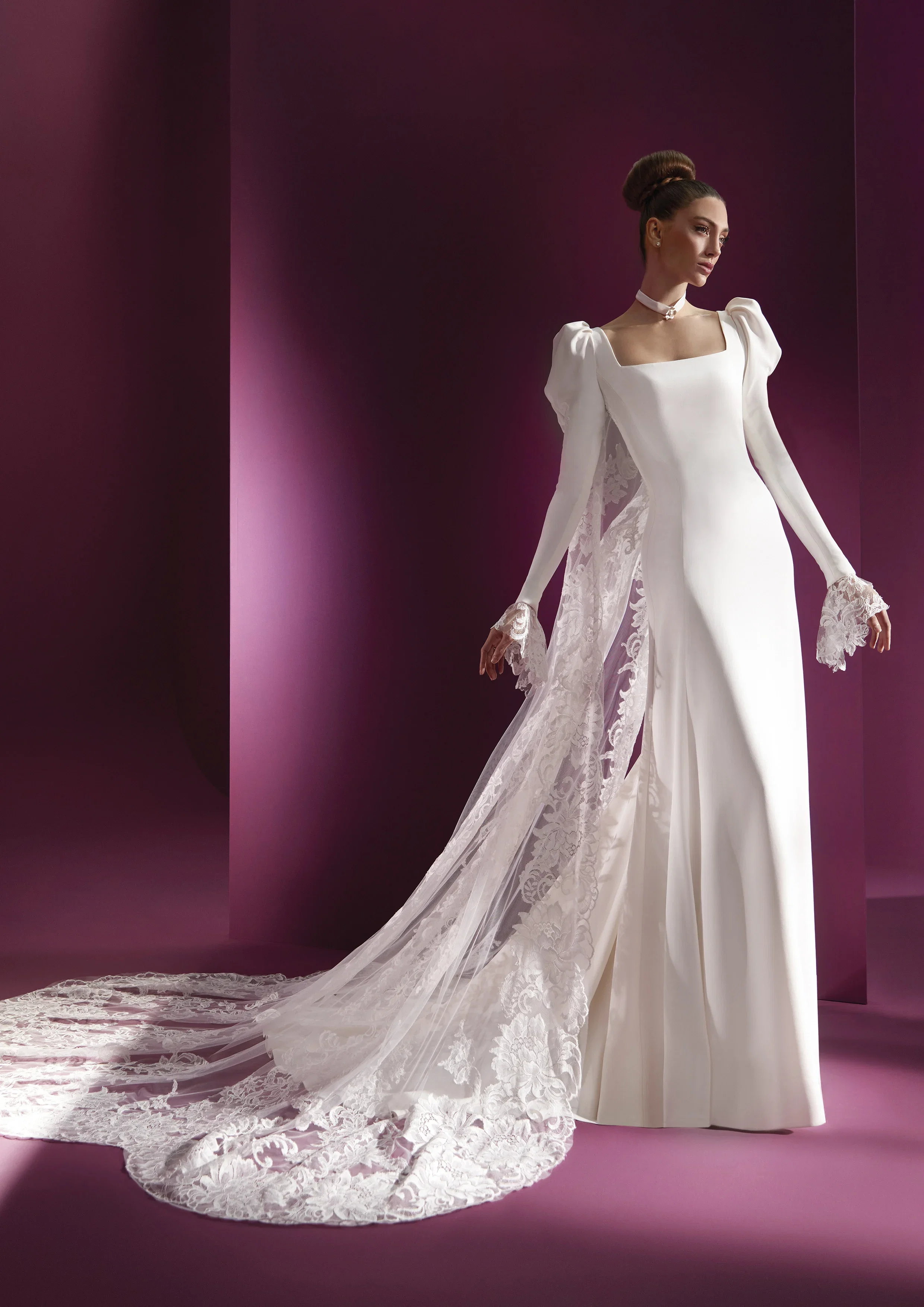 De Marquise valt meteen op door de bekende vierkante halslijn, die in dat tijdperk veel gedragen werd. De jurk is gemaakt van eco-crêpe en heeft lange mouwen afgewerkt met knopen. Het luxe kant onderaan de mouwen geeft de jurk een extra twist. Dit kant is, wanneer gewenst, afneembaar om de jurk een wat simpelere look te geven.
