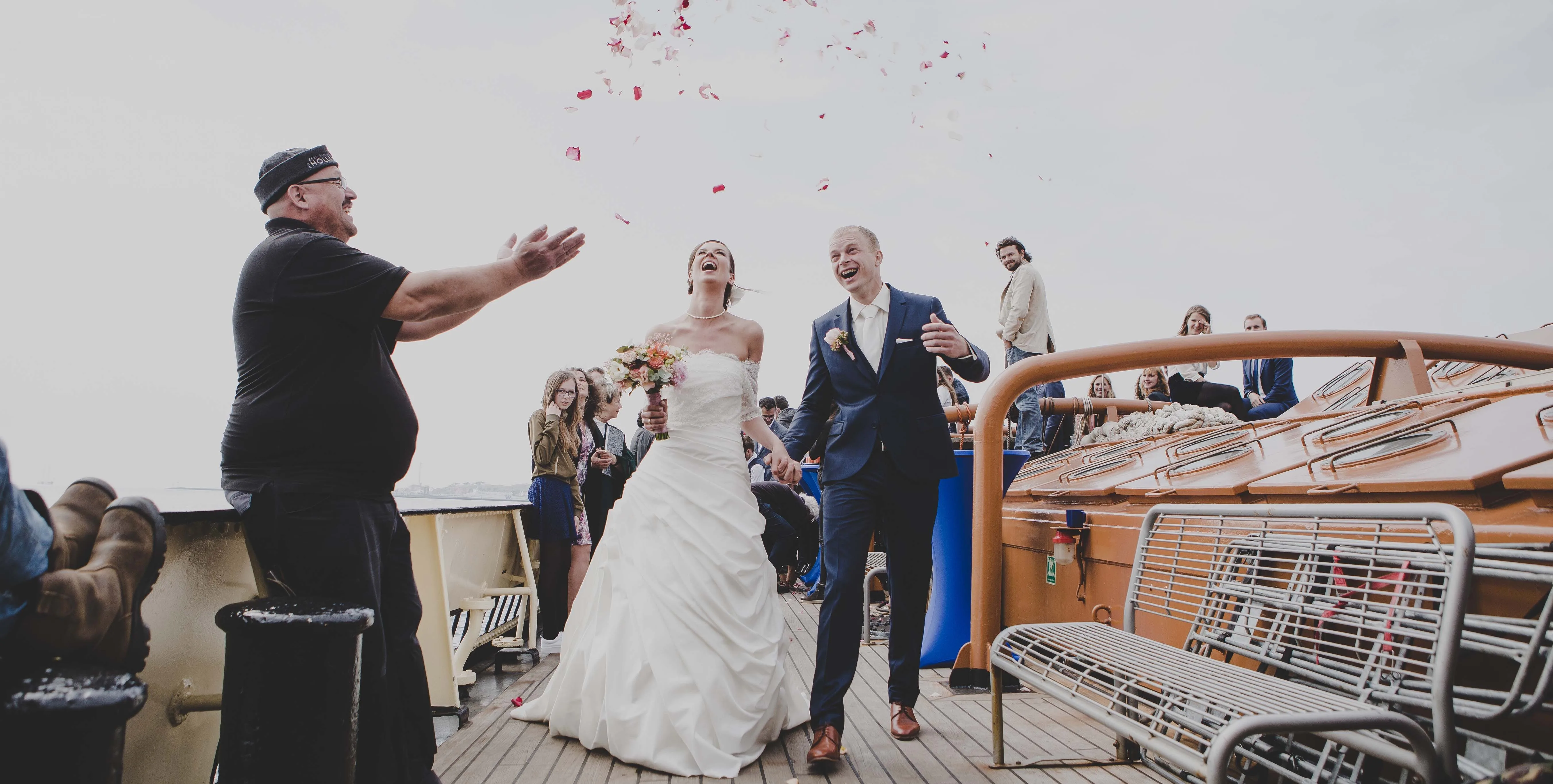 Er worden op die gezellige vrijdagavond liedjes geoefend, flessen bubbels opengetrokken en de kroeg wordt onveilig gemaakt. Het aanstaande bruidspaar slaapt die avond gezellig samen in de kapiteinshut op de Holland. “Gescheiden slapen vonden we niks en dit was een heel bijzondere ervaring!”, vertelt Catootje. Terwijl het bruidspaar zich aan boord klaarmaakt, proberen de gasten alvast een first look te krijgen voordat ze ook aan boord komen voor een heerlijke lunch gevolgd door de ceremonie.