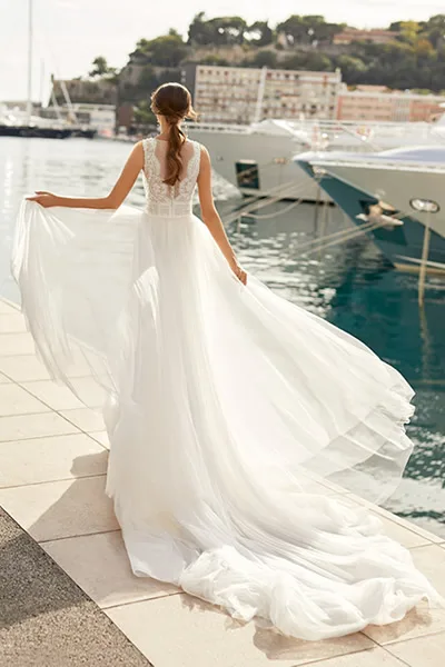 Aire Boho staat voor frisse en romantische trouwjurken. Zachte lijnen kenmerken de jurken van georgette en chiffon met vloeiende rokken en kanten tops. Als nieuwigheid voor 2021 presenteert Aire Boho tule-rokken met horizontale lijnen.