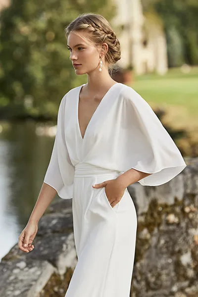 Aire Beach Wedding presenteert duidelijke lijnen. Een van onze favoriete ontwerpen is de crêpe jumpsuit met kanten inzetstukken in de taille en decolleté. Lichte, flatterende zeemeerminjurken zijn een must voor het strandhuwelijksthema.