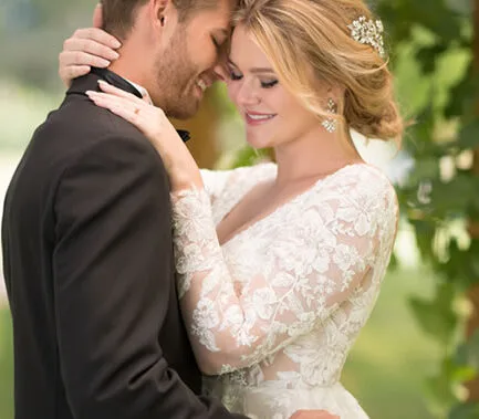 Houd jij ook zo veel van kant? Kant creëert een geweldig gevoel van vintage romantiek. Essense of Australia gebruikt speciale delicate bloemen voor de bruidscollectie. Kan je geen genoeg krijgen van kant? Bekijk de modellen met kanten mouwen of een lange kanten sleep.