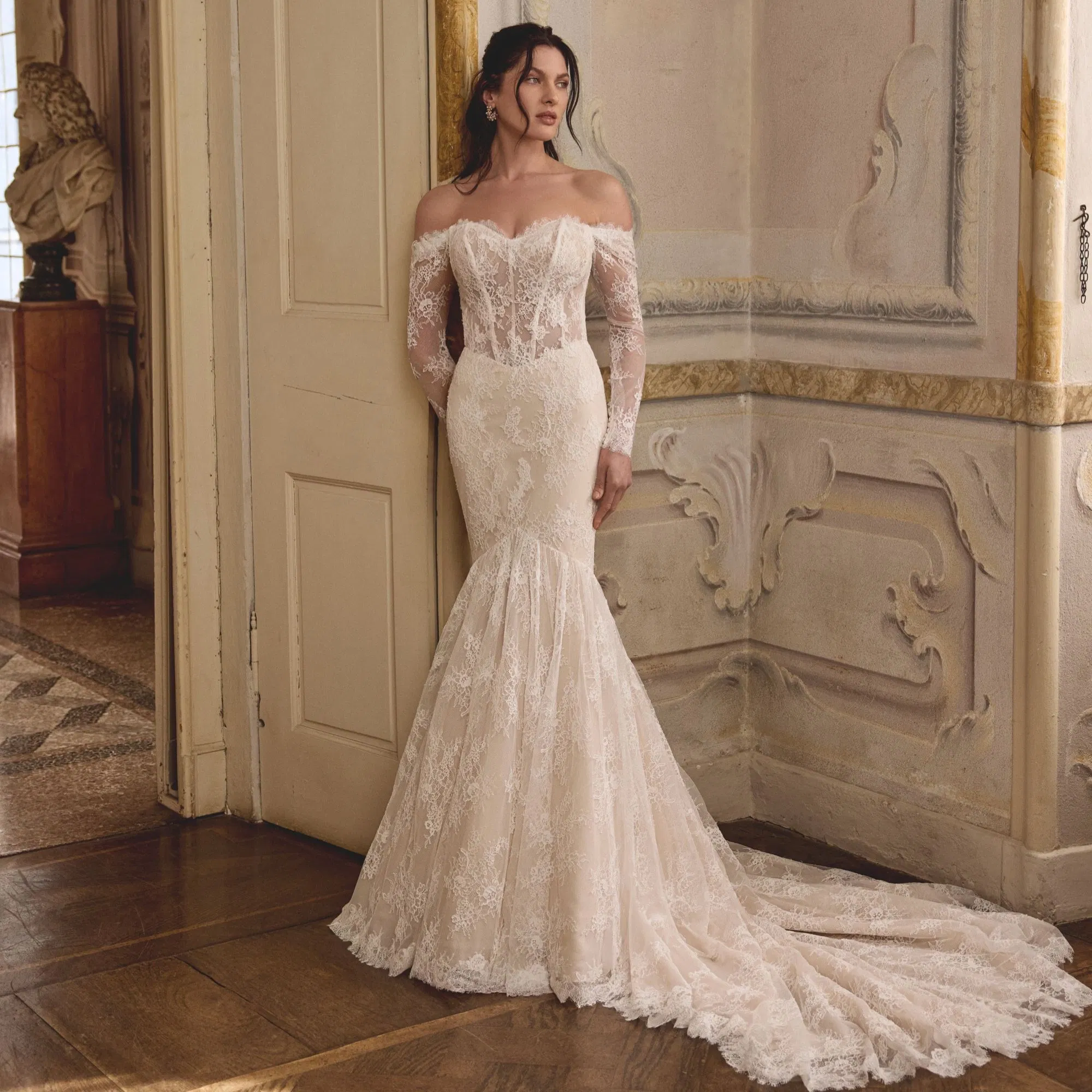 Lolita is een droom voor de romantische bruid uit de nieuwste Justin Alexander collectie. De jurk is gemaakt van hoogwaardig Alençon-kant, dat bekendstaat om zijn delicate structuur en luxueuze uitstraling. De off-shoulder mouwen benadrukken de schouders op een subtiele en vrouwelijke manier. De nauwsluitende pasvorm volgt elegant de natuurlijke rondingen van het lichaam, waardoor een sensueel maar stijlvol silhouet ontstaat. De dramatische zeemeerminrok geeft extra volume en beweging, waardoor je bij elke stap een indrukwekkend entree maakt.