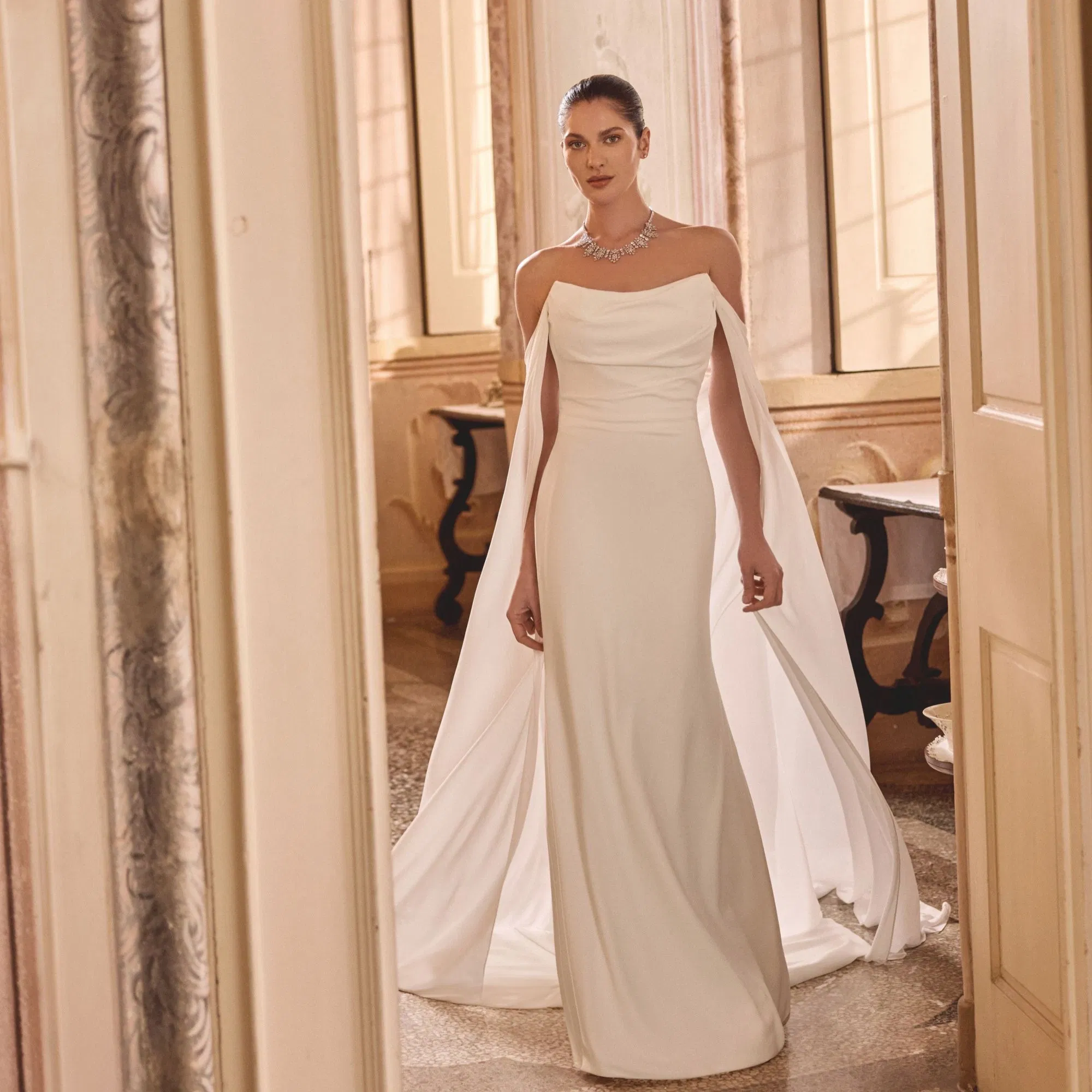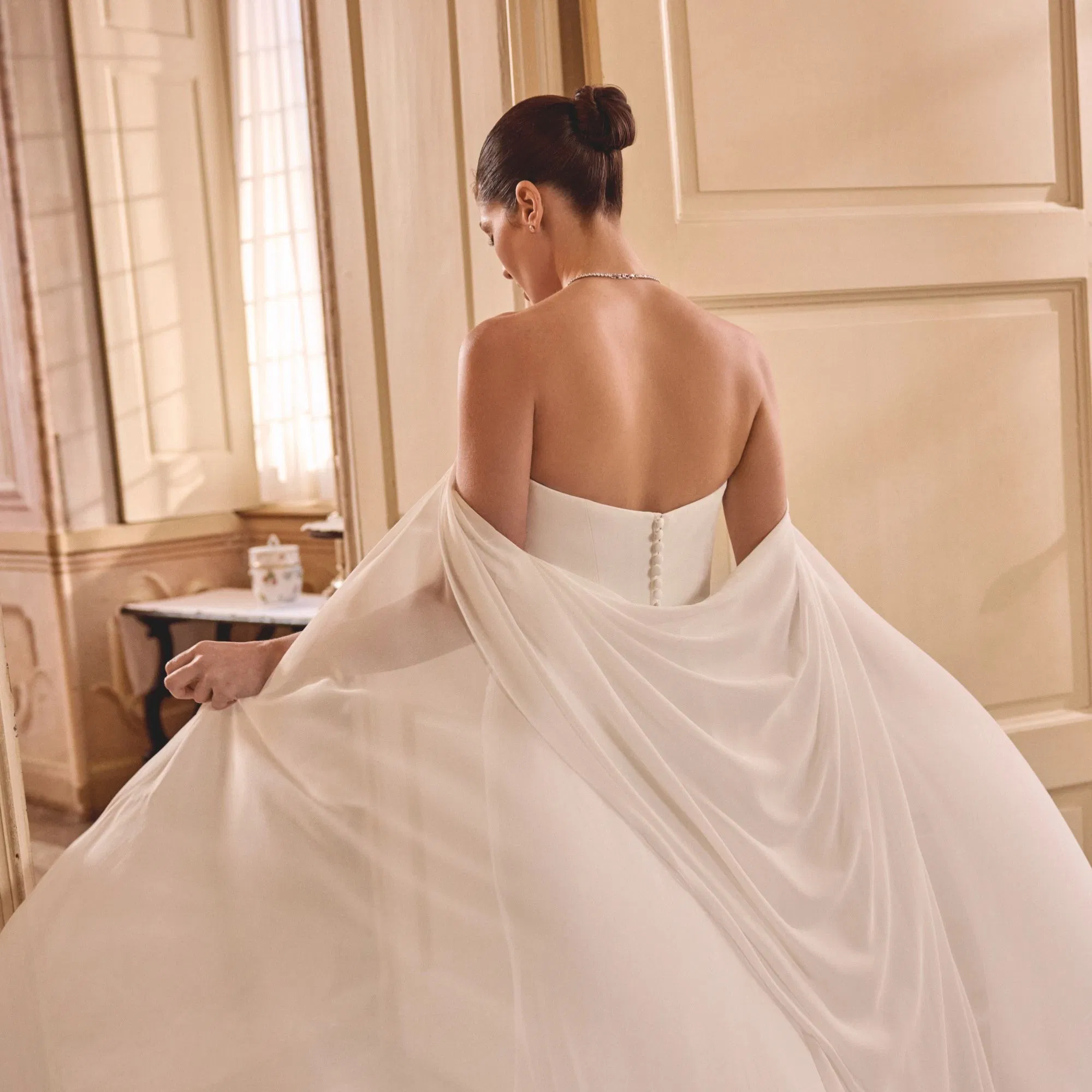 Leti straalt moderne elegantie uit. Het stijlvolle cateye-decolleté zorgt voor een sterke, verfijnde uitstraling die je hals en sleutelbenen prachtig accentueert. De subtiele drapering op het lijfje voegt een zacht en flatterend effect toe, waardoor het silhouet bewust wordt gecontoureerd. Wat Leti extra bijzonder maakt, is de afneembare chiffon cape. Deze luchtige, vloeiende cape creëert een bijna filmisch effect wanneer je loopt alsof je in slow motion door het gangpad zweeft. Draag de cape voor een dramatische ceremonie-look en verwijder hem later voor een meer ingetogen en feestelijke uitstraling.