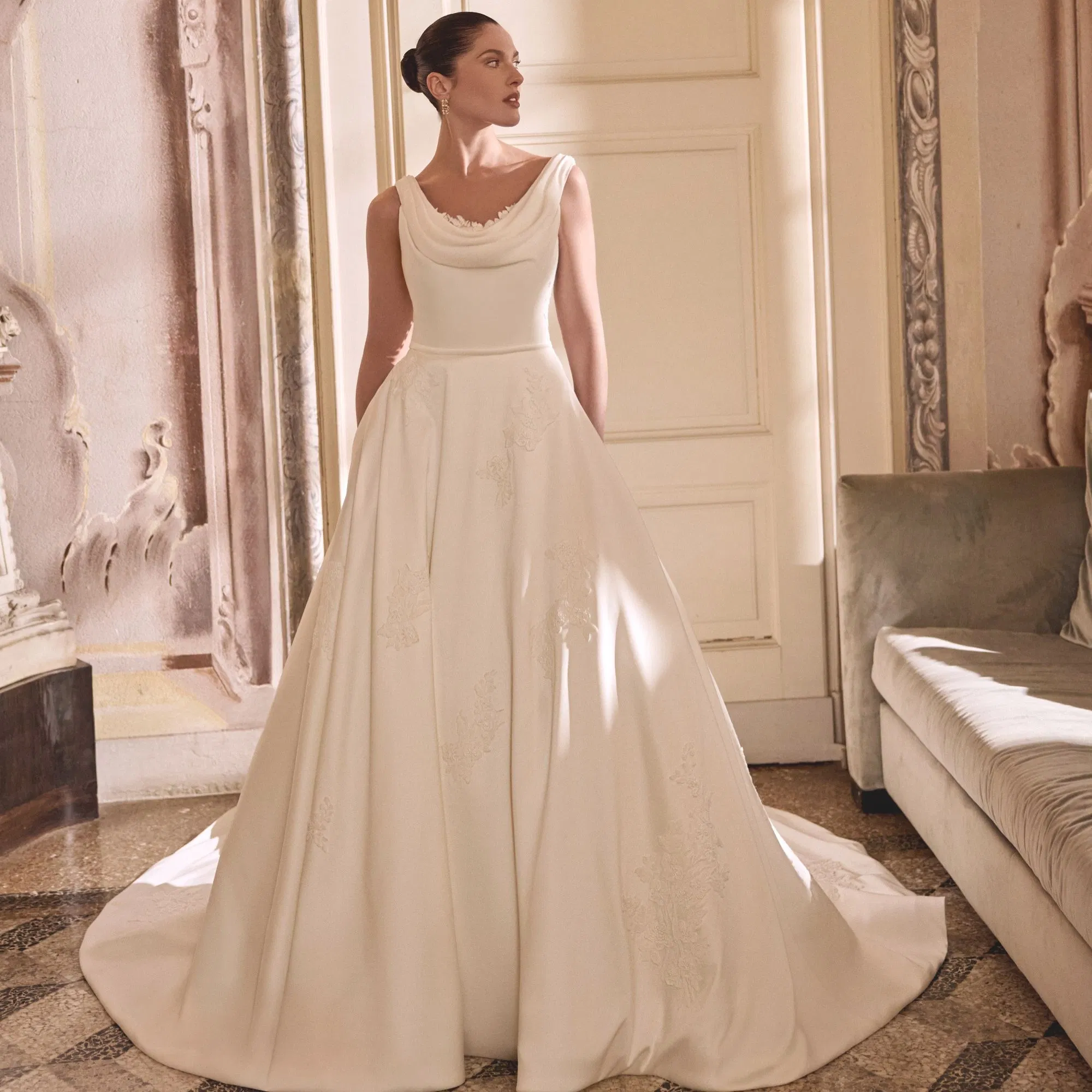 Lindsay combineert klassieke romantiek met moderne details. De gedrapeerde peek-a-boo halslijn zorgt voor een speels accent, terwijl fijn kant het decolleté siert. De jurk is subtiel versierd met verfijnd kant, dat met zorg is geplaatst op het decolleté. Dit kant loopt vloeiend door op de rok en keert terug in de V-vormige uitsnijding op de rug. Deze details geven Lindsay een zachte, bijna sprookjesachtige uitstraling, zonder te zoet te worden.