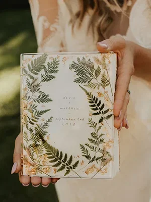 Natuurlijke boho-elementen in gastenboeken zien er bijzonder mooi uit. De voorkant kan ook worden versierd met bijvoorbeeld gedroogde bloemen en andere versiersels.