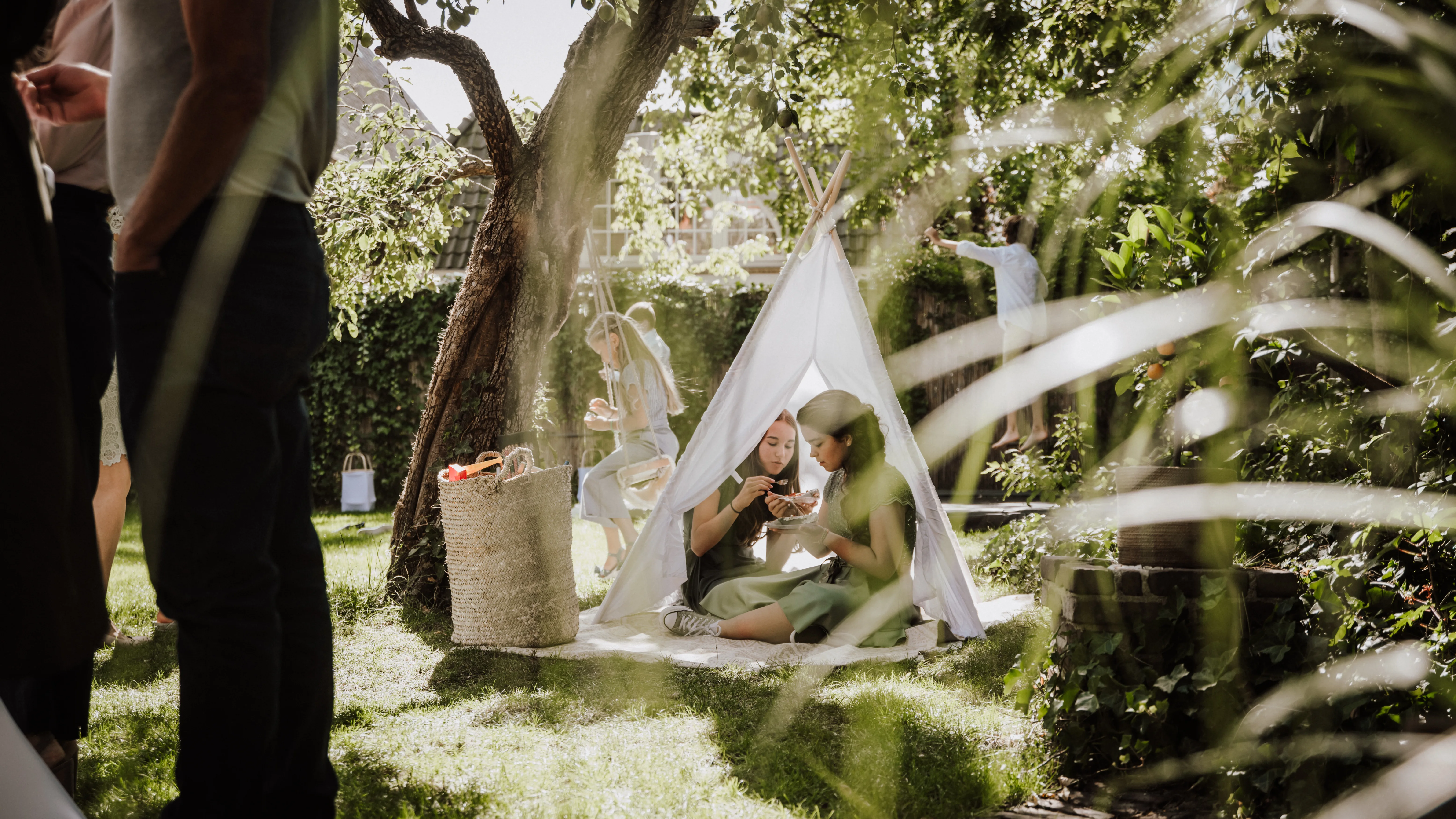 De ceremonie vindt plaats in de stadstuin en wordt voorgezeten door de zus van Bas. “Wij wilden graag een persoonlijke ceremonie waarbij de babs ons ook echt kent. Geen standaard praatje, maar een persoonlijk verhaal waarin wij de hoofdrol spelen”, zegt Marieke. “Mijn schoonzus wilde ons heel graag trouwen en dat vonden wij een heel mooi idee. Dus hebben we haar een cursus cadeau gegeven en heeft zij ons in de echt verbonden.” Bas vult aan: “Het moment dat we daar in de stadstuin stonden, omgeven door onze kinderen en dierbaren, was zo mooi! We hadden van tevoren niet kunnen dromen dat het zo mooi zou zijn. We hadden weer even het gevoel dat we in Italië waren. Het was ons eigen Venetiaanse sprookje.”
