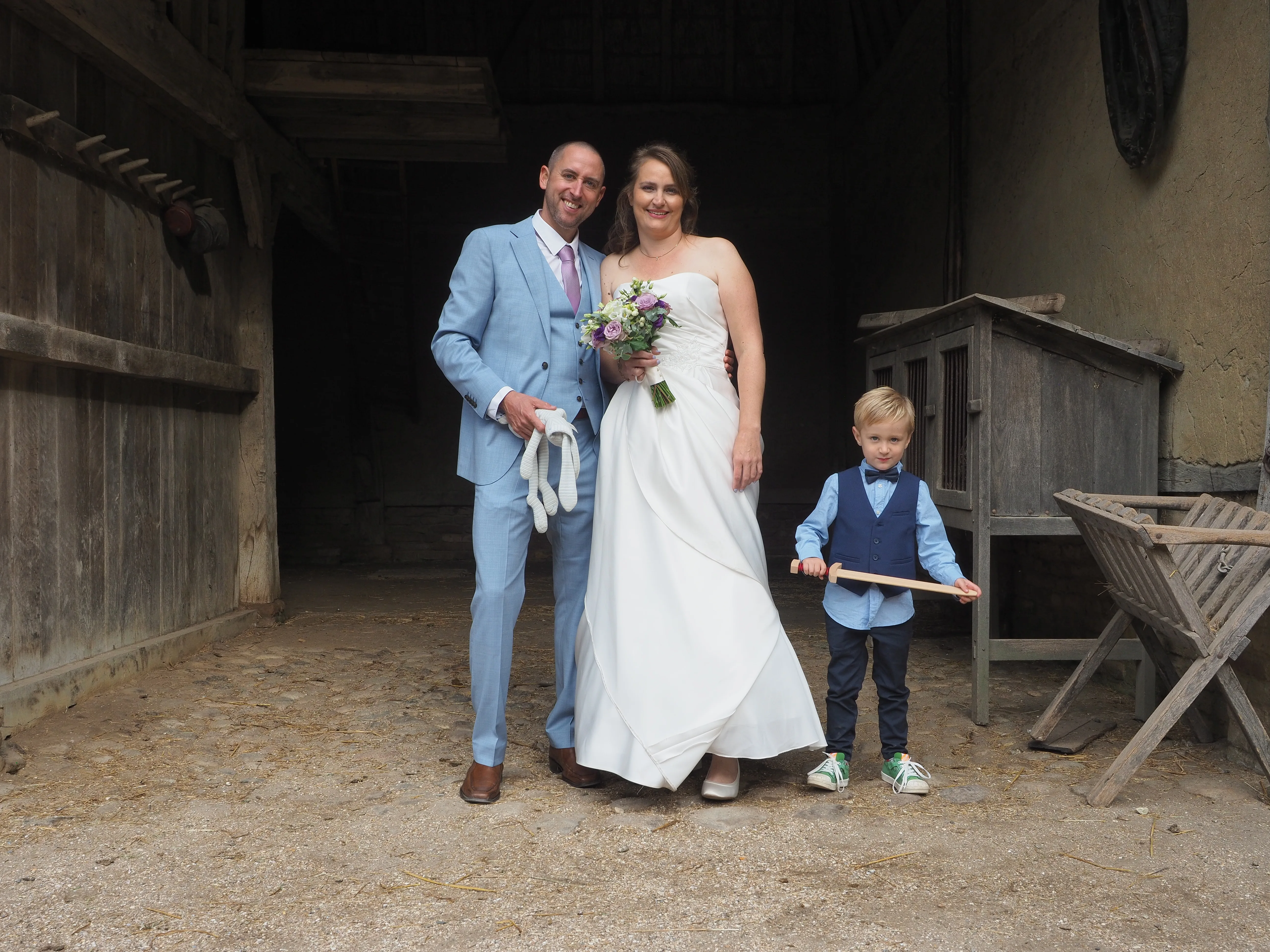 “De trouwambtenaar was een heel lieve, betrokken vrouw en ze betrok Tim overal bij tijdens de ceremonie. Hij mocht het huwelijk inluiden met een speelgoedzwaardje en aan ons vragen of we met elkaar wilden trouwen. Het was mooi om te zien hoe hij een rol in de ceremonie speelde. Onze geloften waren heel emotioneel en de ceremonie was warm en intiem. Het was zo’n heftig afgelopen jaar, op dat moment leek het alsof ik alle gebeurtenissen even een plekje kon geven.” – Janette