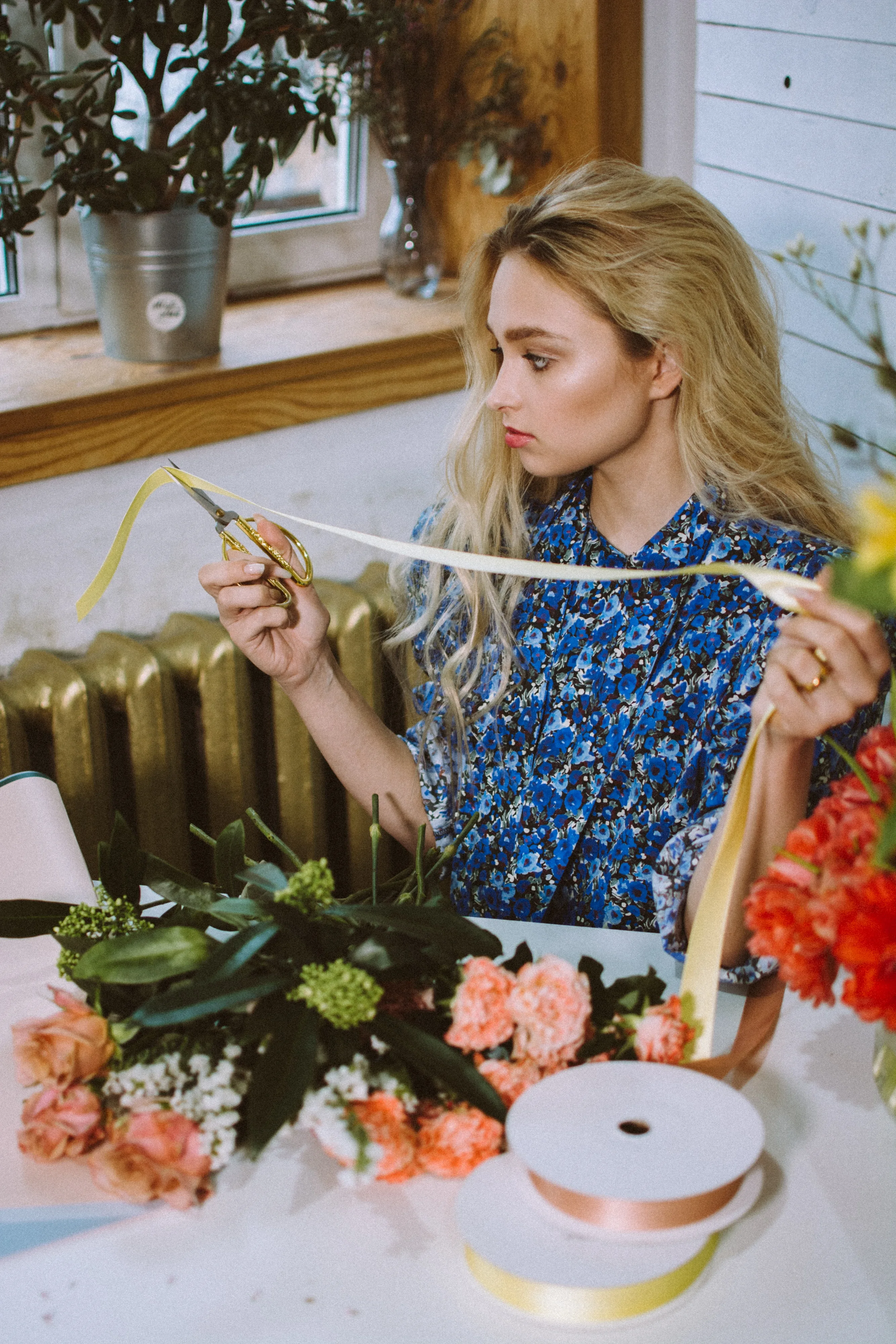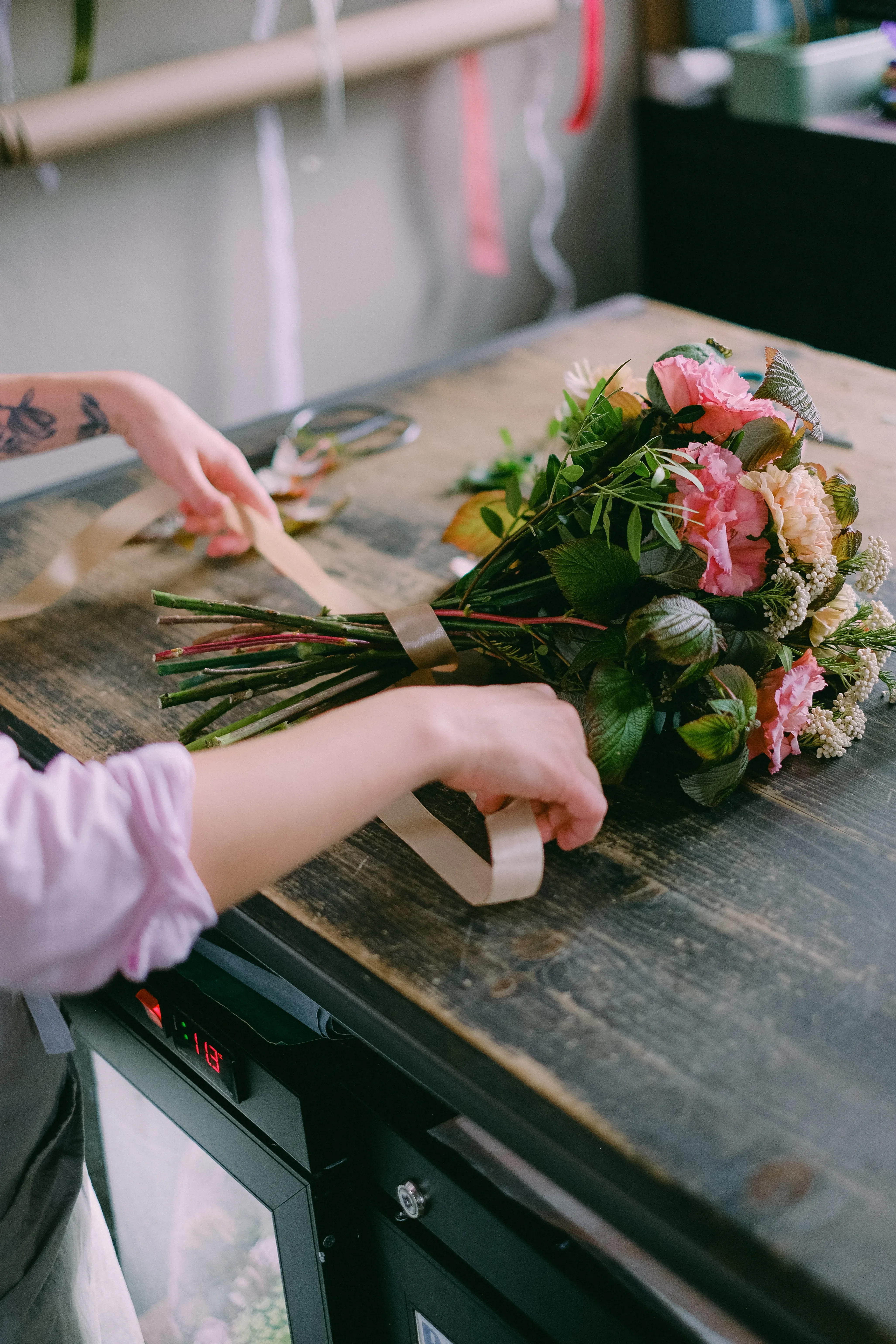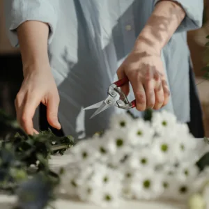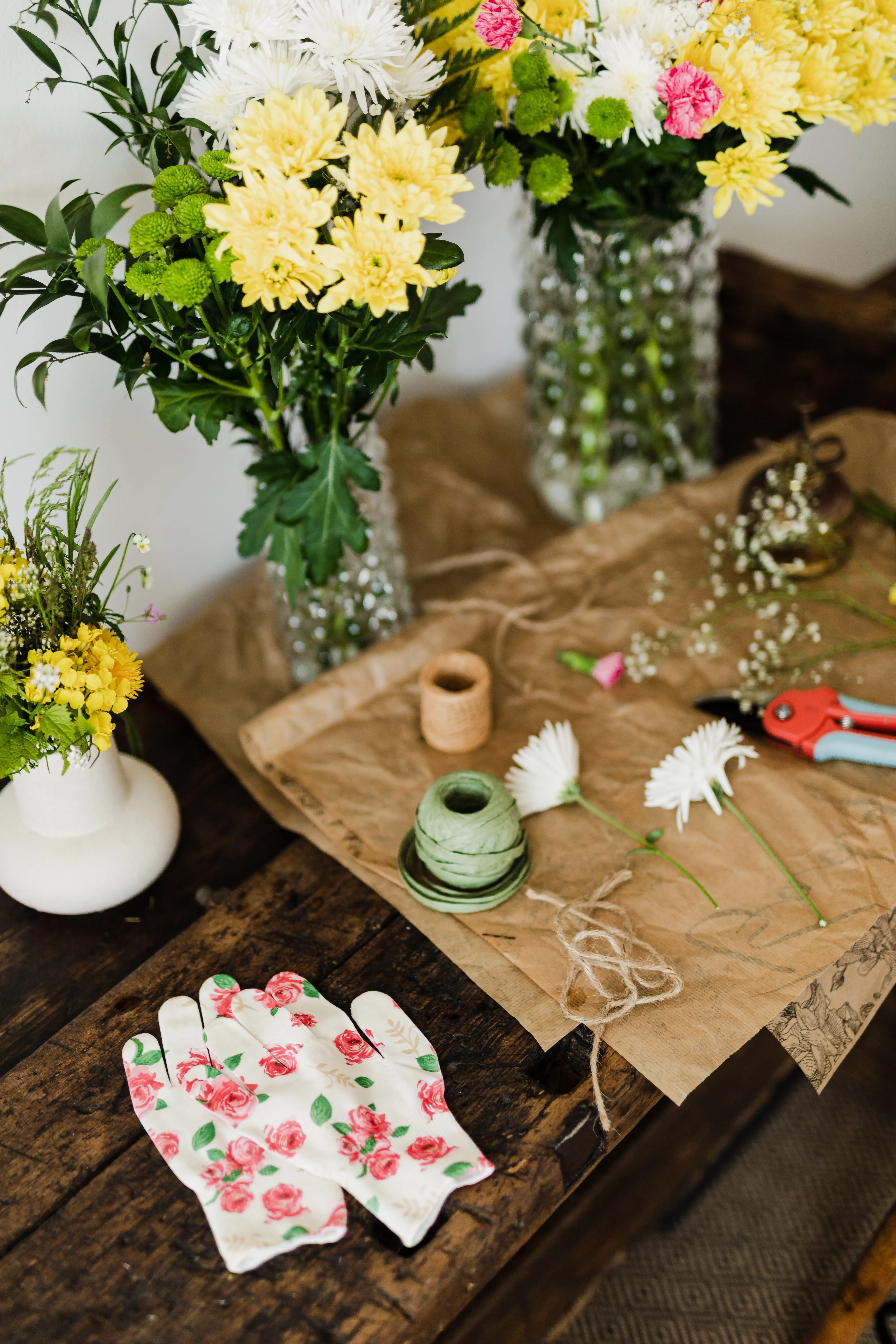 Behalve bloemen heb je ook andere materialen nodig, zoals een schaar, bloementape, touw en lint. Zorg dat je alles bij de hand hebt voordat je begint.