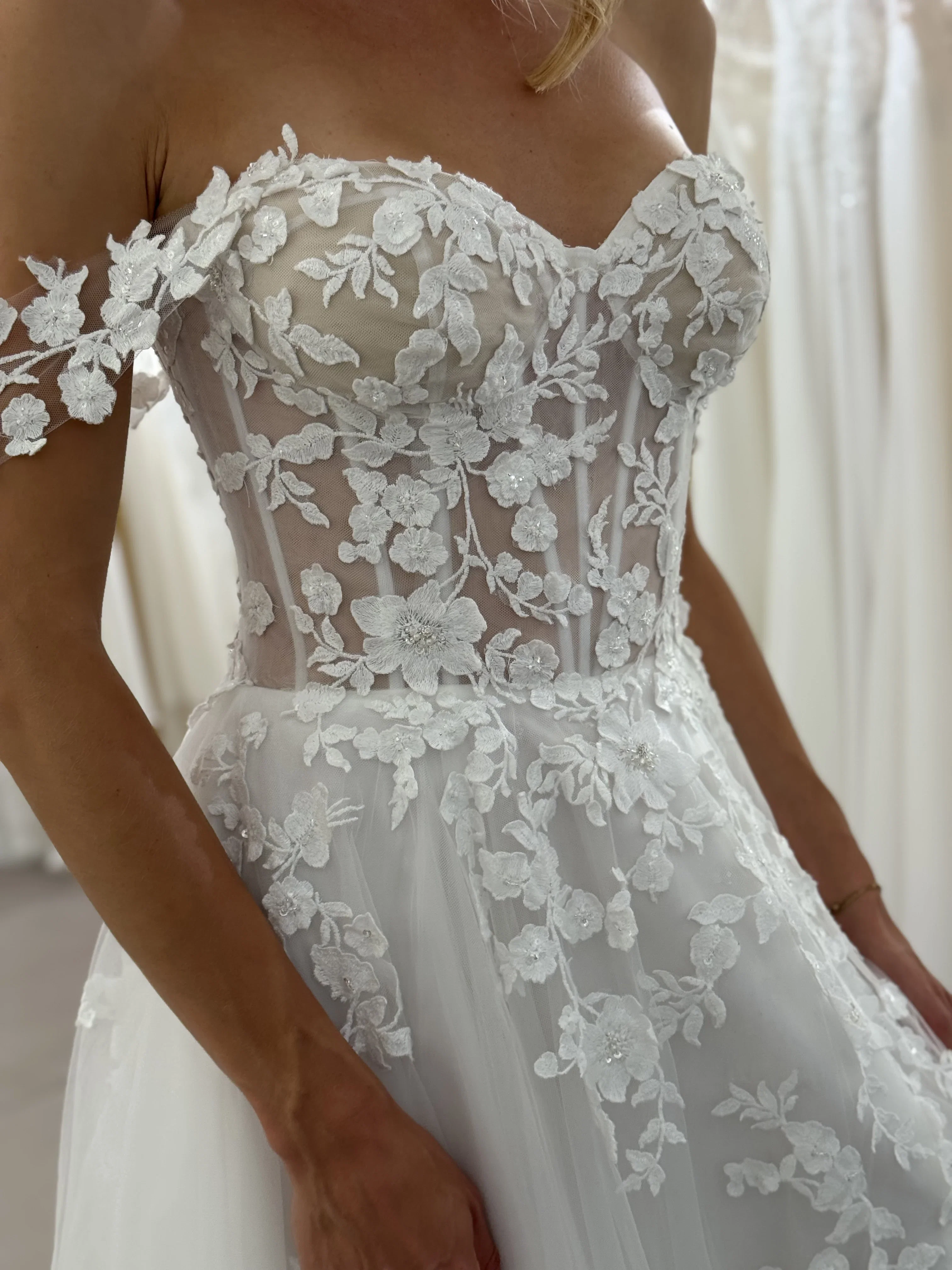 Een moderne kanten trouwjurk met korset is dé keuze voor bruiden die houden van romantiek, maar dan met een frisse twist. Het semi-transparante korsetlijfje laat net genoeg huid zien om verleidelijk te zijn, zonder zijn elegantie te verliezen. De zichtbare baleinen geven structuur aan trouwjurk Bennet en creëren dat geliefde zandloper silhouet, terwijl vetersluiting aan de achterkant zorgt voor een perfecte pasvorm.