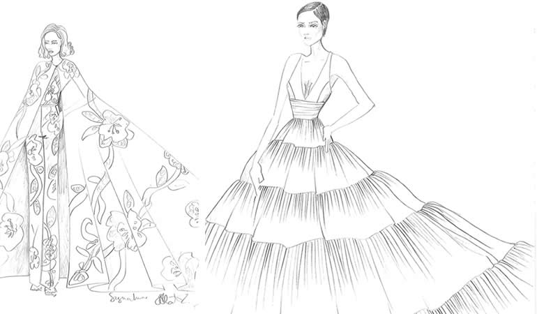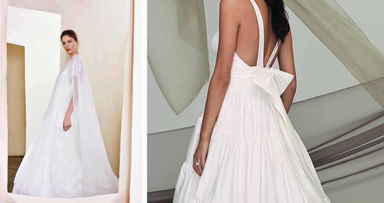 “Een andere favoriete jurk is Kalina (links). De patchwork-cape is bezaaid met geborduurde romantische bloemen en symboliseert ware liefde. De jurk is in combinatie met het eenvoudige silhouet van de fit’n flare-mantel alles wat je je maar kunt wensen voor de allermooiste dag.” “In de Justin Alexander Signature-collectie staan deze twee ontwerpen hoog op mijn favorietenlijst. Het Roma-model (rechts) uit de nieuwe 2020-collectie vind ik geweldig. Deze moderne tafzijde baljurk is een coole herinterpretatie van de clean chiclook. Voor dit bijzondere model combineerde ik een geplooide buikband met een meerlagige rok.”