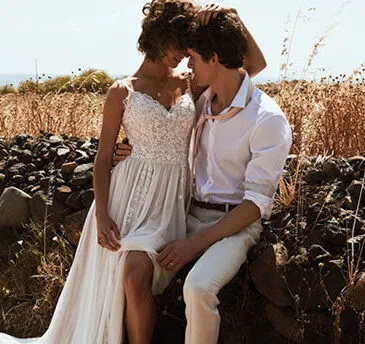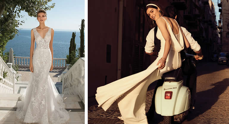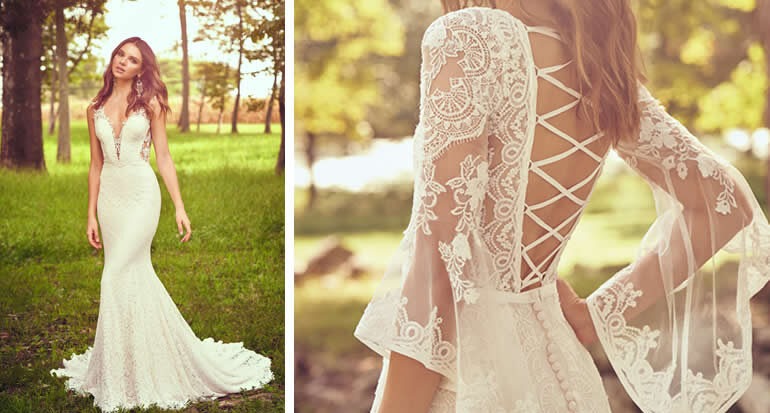 “Deze jurk van Venetiaans kant (linker jurk) met een kleine sleep belichaamt pure romantiek. Ik ben een grote fan van een diep illusiedecolleté met cut outs aan de zijkant.” “Deze klassieke A-lijn jurk (rechts) is een boho-droom die uitkomt. De ballonmouwen en de moderne, geregen rug zorgen voor een magisch totaalplaatje.”