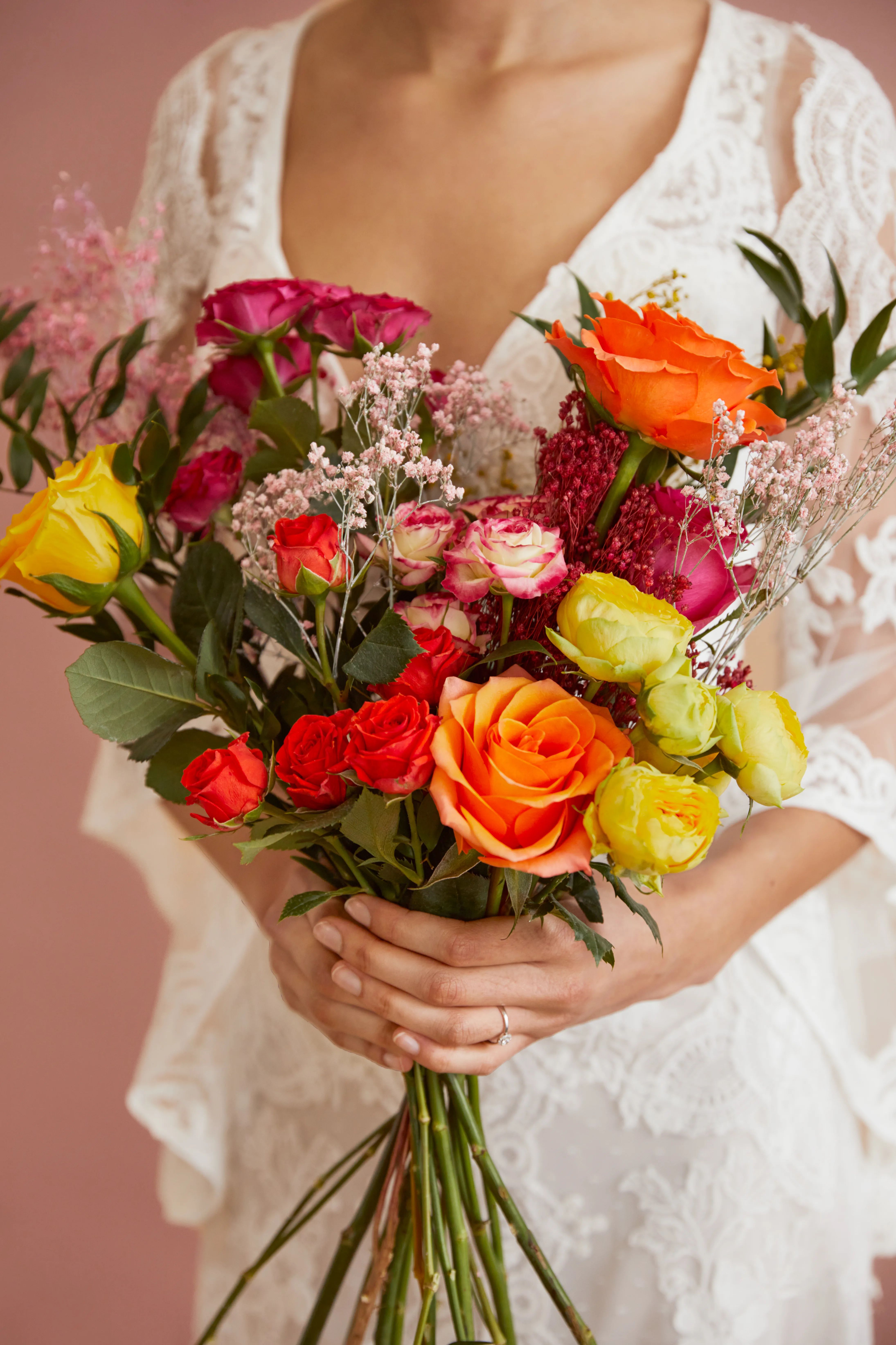 Als je van groot houdt, kies dan voor een statement boeket. Een groot boeket kan bijvoorbeeld worden samengesteld uit mooie bloemen zoals pioenrozen, zonnebloemen of zonneoogjes. Houd er wel rekening mee dat een groot boeket niet altijd geschikt is voor elke jurk, maar het kan zeker de show stelen.