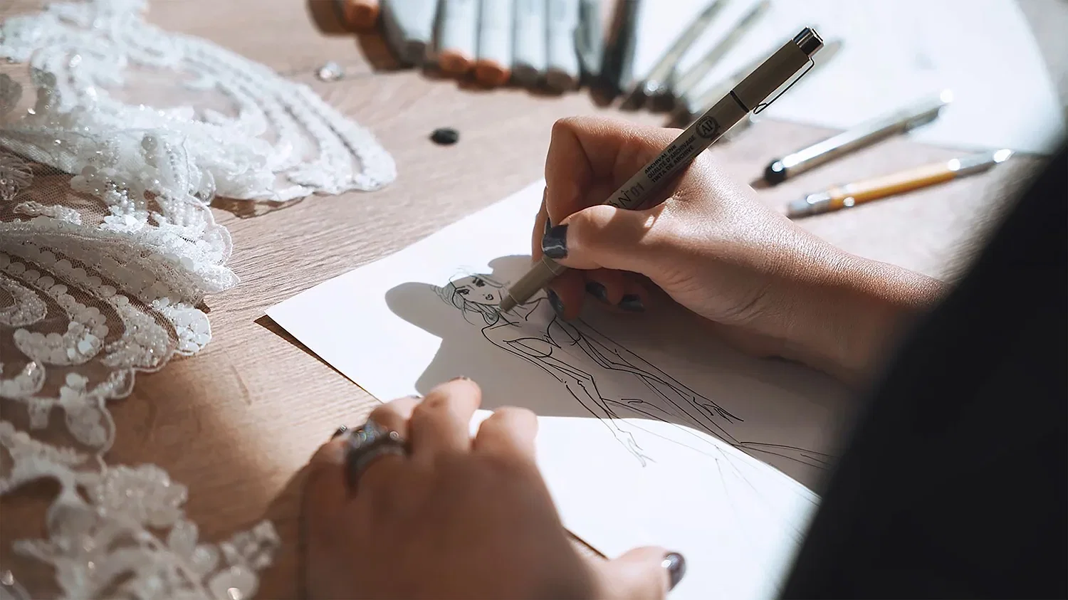 Het is best een uitdaging om zoveel jurken te ontwerpen. Wat ik doe, is gewoon ontwerpen totdat ik niets meer kan bedenken. Daarna bekijk ik de groepering van de jurken. Iedere collectie moet passen bij dat specifieke type bruid. Onze Curve-collectie is net wat anders, daar moet de bruid in elke look een mogelijkheid hebben.