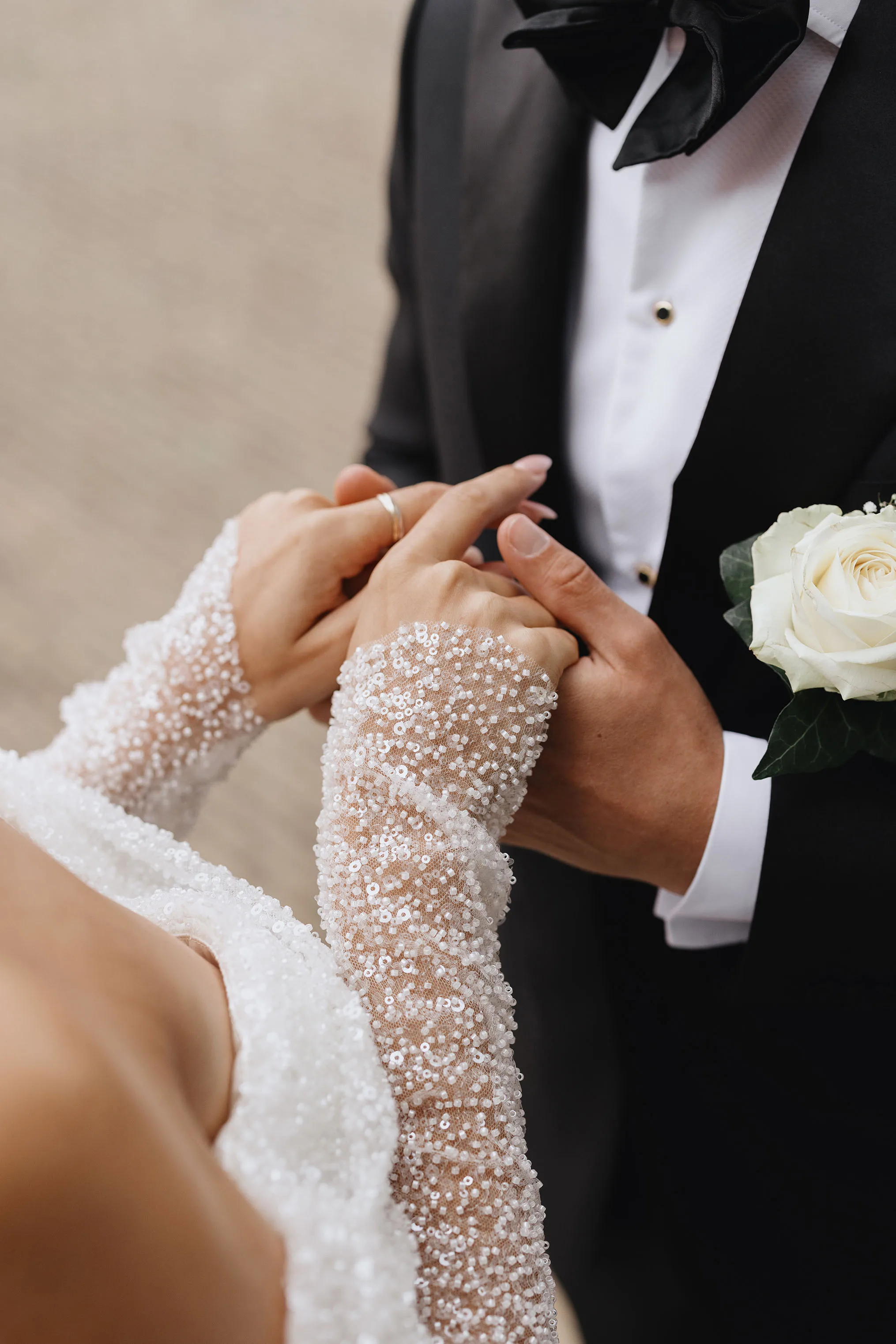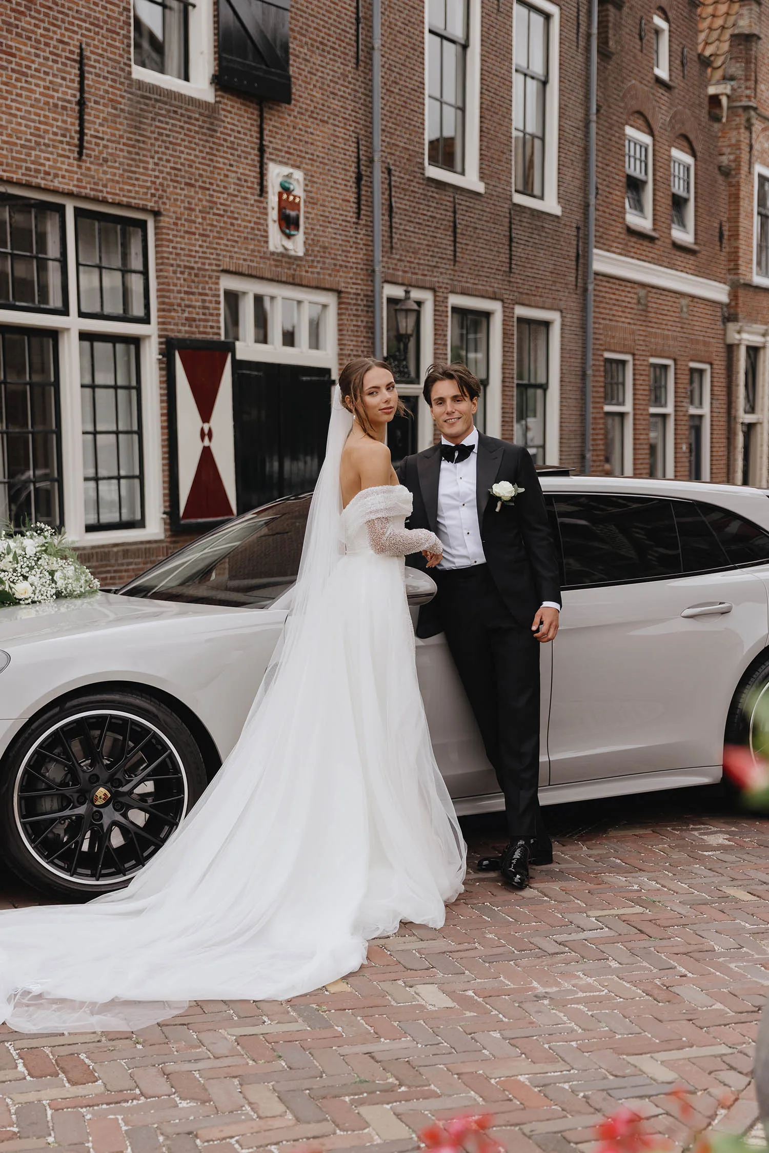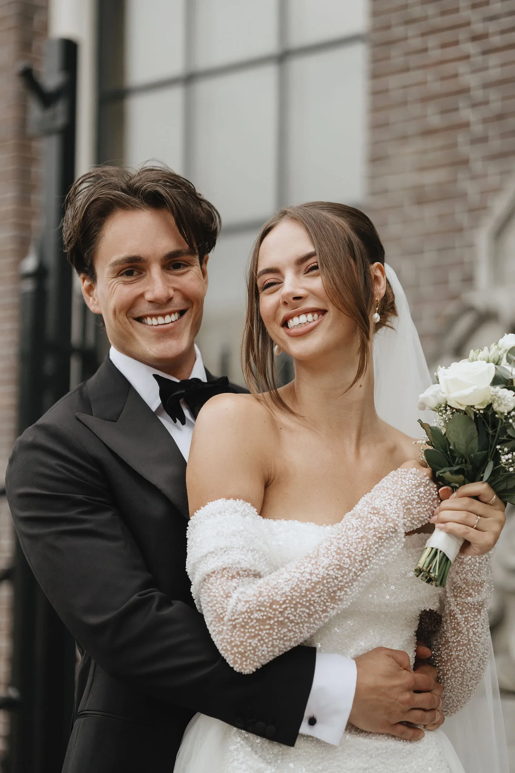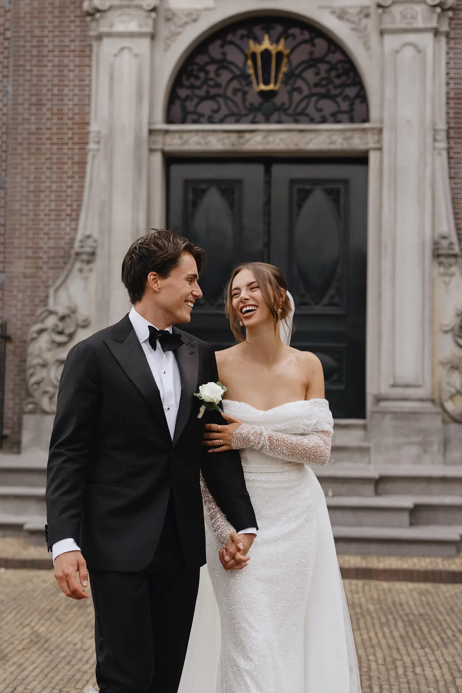 Vanuit zijn ouderlijk huis kwam Cornel bij Julia aan voor de first look. “Toen ik haar voor het eerst zag, dacht ik echt: wauw, wat heb ik toch een geluk! Ze was prachtig.” Julia: “Cornel is muzikant, dus hem heb ik al vaker in pak gezien, maar dit was wel anders. In je hoofd is een first look spannend, maar ik wilde hem vooral knuffelen en het maakte mij niet zoveel uit hoe hij eruit zag.”