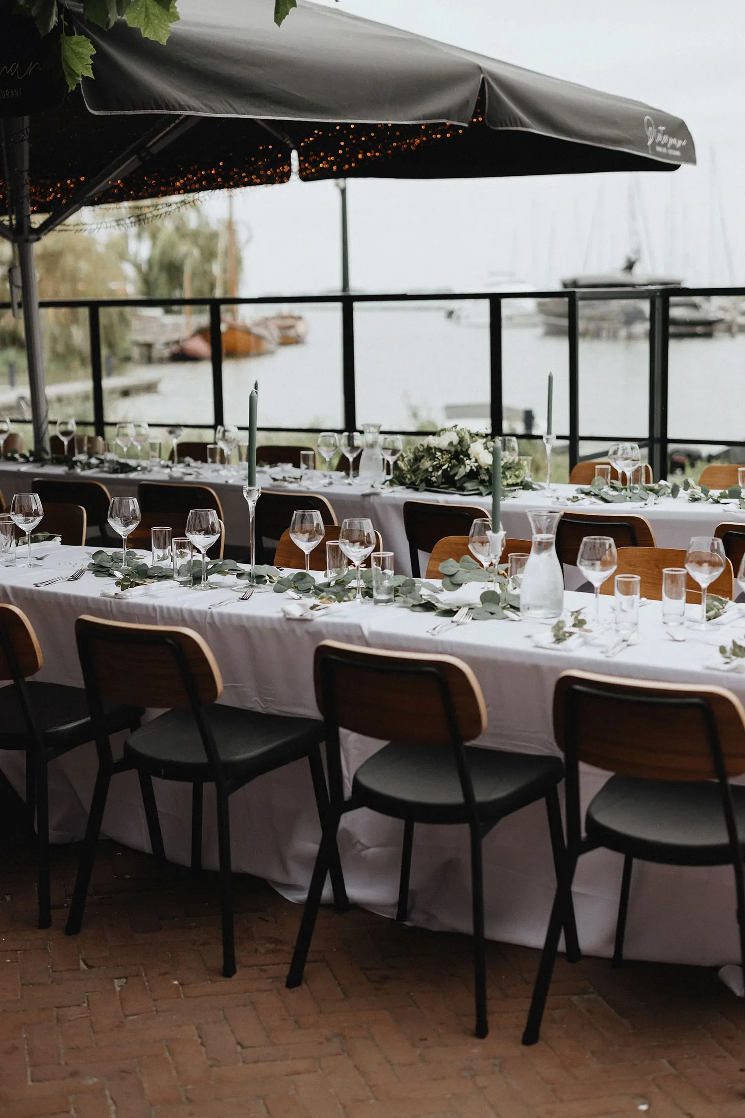 Hoewel een romantisch diner in de buitenlucht op de planning stond, gooide de regen letterlijk roet in het eten. “We hadden één lange tafel klaargezet en versierd, met prachtig uitzicht op de haven. Alles moest snel naar binnen verplaatst worden in losse tafels en verspreide decoratie, dat was wel jammer”, laat Julia weten.