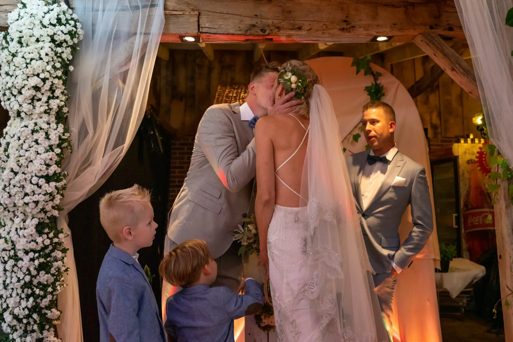 “Steffan en ik wilden onze grote dag anders doen en kozen voor een verrassingsbruiloft. We hadden de gasten uitgenodigd voor mijn verjaardag en we waren die dag ook nog eens tien jaar samen. We hadden ze verteld dat ze er stipt om vier uur moesten zijn vanwege een live show. Toen de gasten er waren hebben we ons snel omgekleed in onze trouwoutfits. De gasten wachtten in de tuin, een deel ervan was afgezet met een doek. Toen het doek viel kwam daar een altaar tevoorschijn en wij kwamen naar buiten in vol ornaat. Iedereen was verbijsterd, dat zie je nog op de foto’s terug.”