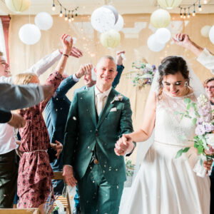 Cabaretier Jelle Kuiper leidde de ceremonie: we hebben heel hard gelachen en een traantje gelaten om zijn verhaal. Hij betrok de gasten erbij waardoor het een leuke, interactieve ceremonie werd. Heel belangrijk was de rol van onze dochter. Wij, maar vooral zij, zeiden dan ook: ‘we gaan met z’n drieën trouwen’. Zij droeg een miniversie van mijn trouwjurk, gemaakt van dezelfde stof. Nadat Jos en ik de ringen hadden uitgewisseld kreeg zij ook een ring en mocht ze de akte ondertekenen. Het was een ceremonie als gezin, dat voelde extra bijzonder. Voor haar ook natuurlijk, en tijdens de ceremonie was ze redelijk onder de indruk.