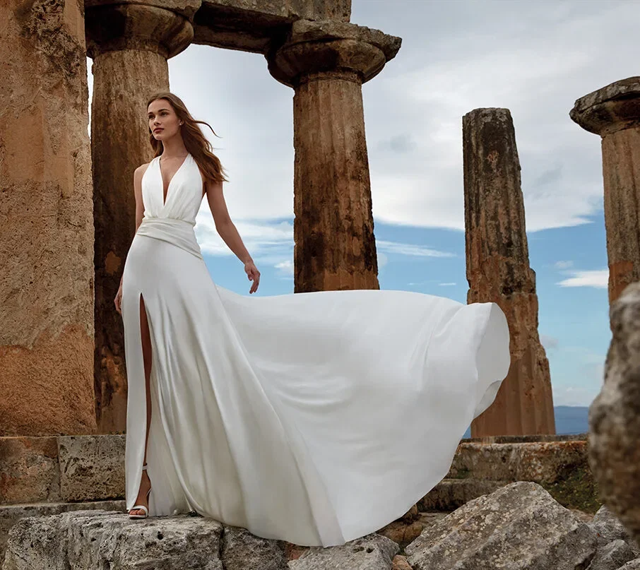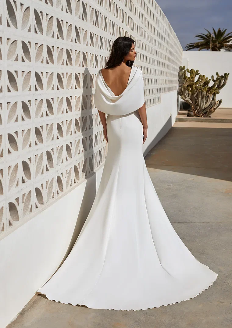 Jurk Abby van Pronovias is een combinatie van modern en klassiek. De vloeiende rok heeft een sensuele split en het gedrapeerde lijfje heeft brede bandjes. De afneembare korte cape zorgt voor de opvallende mouwen.